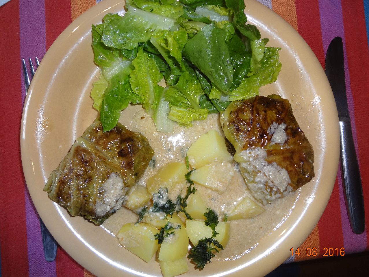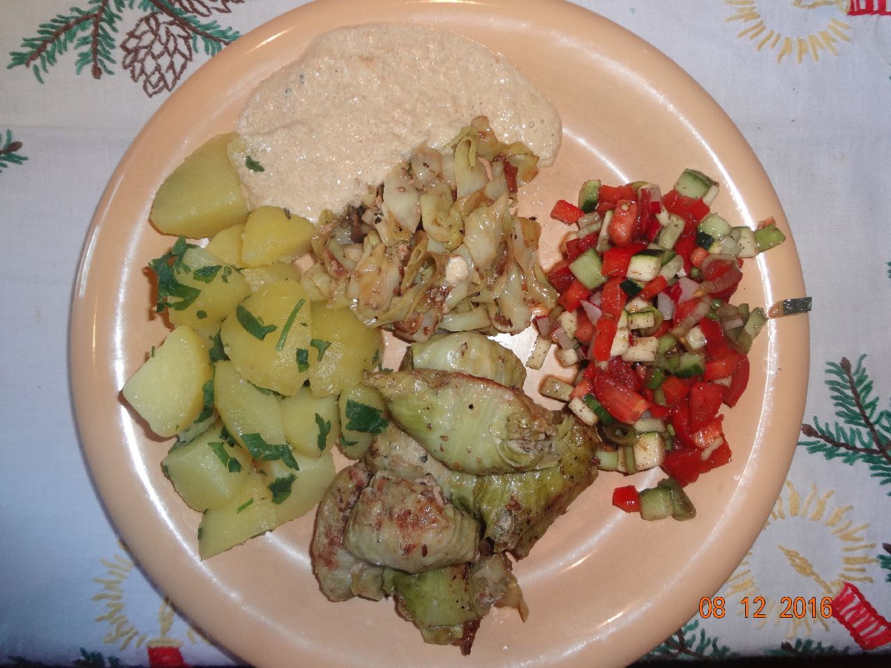 Mini-Kohl-Rouladen, Petersilien-Kartoffeln, hh-Soße, Tomaten-Paprika-Gurke-Zuccini-Salat