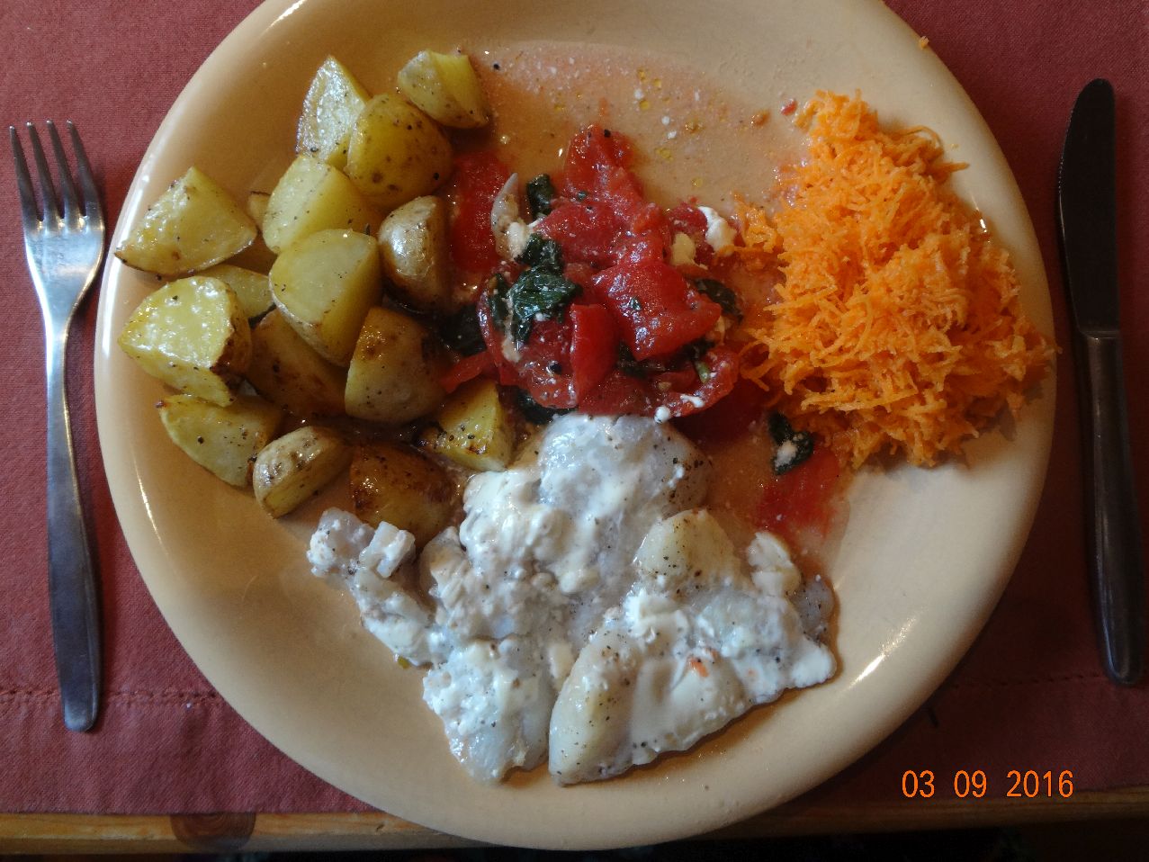 Rotbarsch-Filet auf Zitronen-Kartoffeln und Tomaten-Gemüse, Möhren-Salat