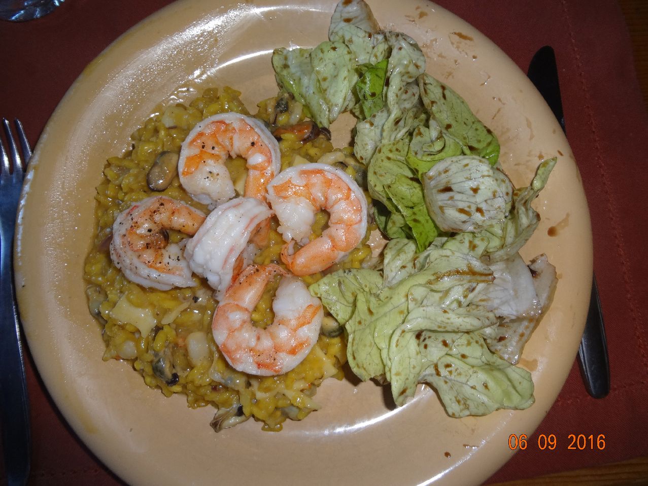 Riesen-Garnelen auf Risotto mit Meeresfrüchten und Salat-Herzen