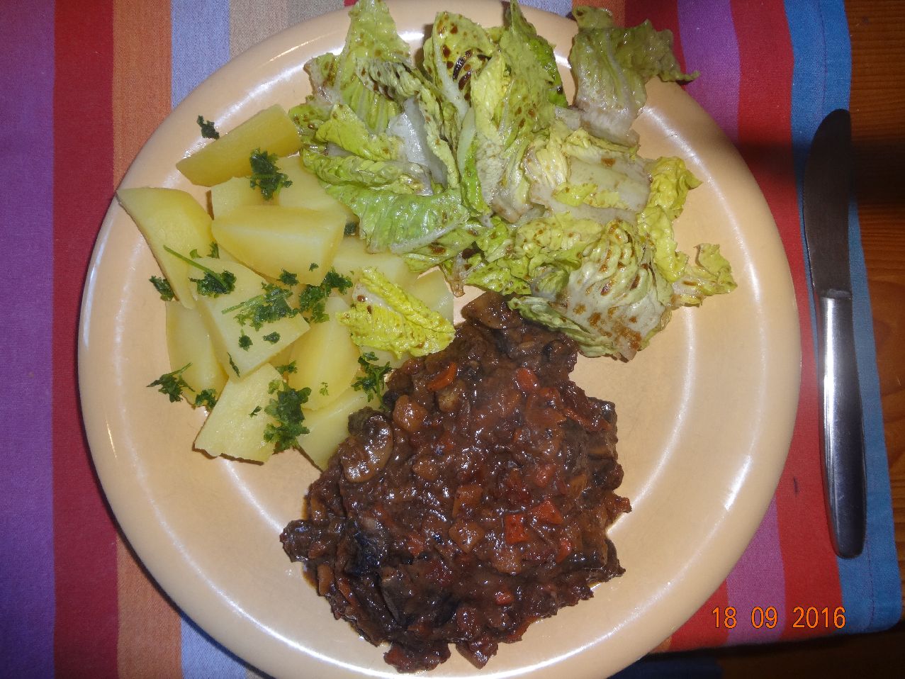 Känguru-Hirsch-Gulasch mit Pilzen, Rosmarin-Kartoffeln, Lollo-Bionda-Salat