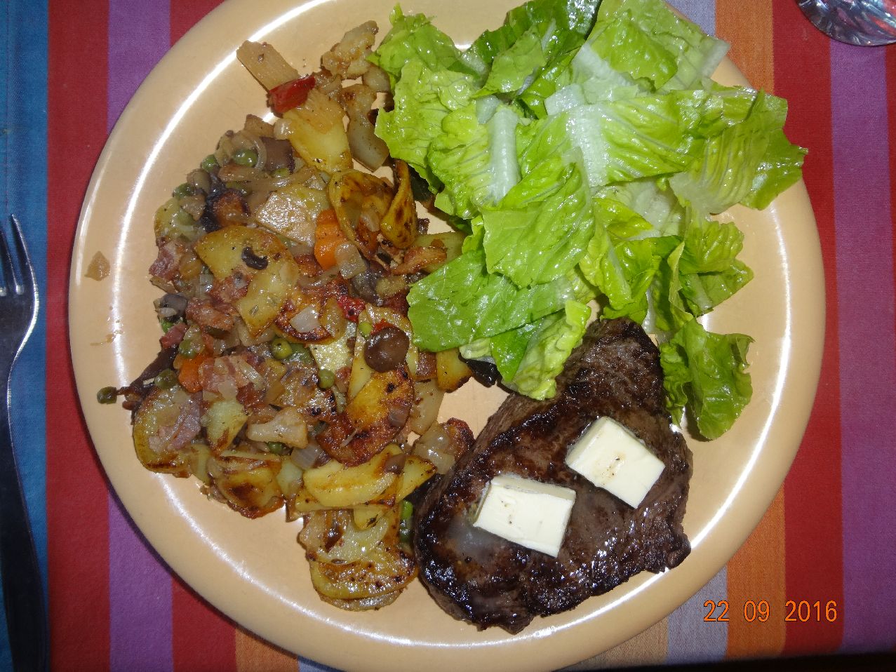 Entrecôte mit Pilzen in Rotwein-Soße, Pet.-Kartoffeln, Salat