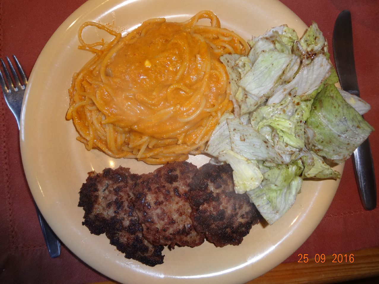 Bandnudeln mit Soße aus Souflaki-Würfeln, Ajvar, Arabiata und Kokosmilch, Salat-Mix