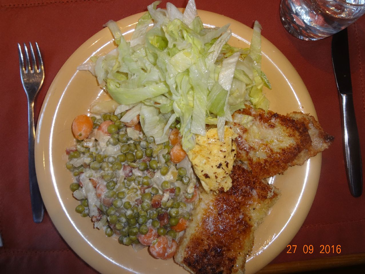 Hoki und Rotbarsch in Kokos-Panade auf Leipziger Allerlei in Weißwein-Sahne-Soße, Eisberg-Salat