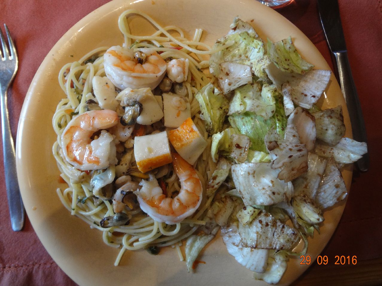 Spaghetti mit Meeres-Früchten und einer Soße aus Tomate, Oliven, Sardellen, Petersilie, Rum, Basilikum, Eisberg-Salat