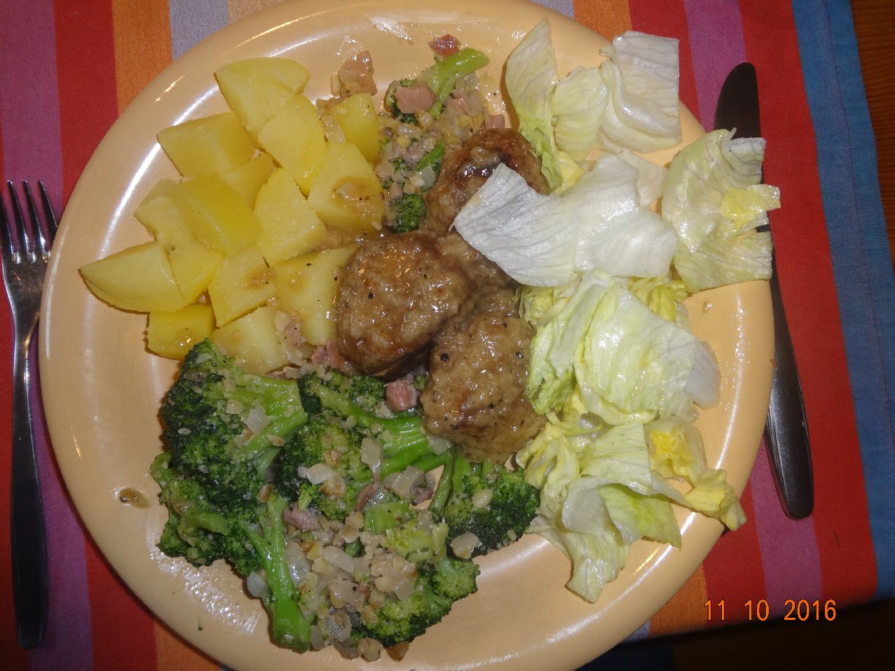 Fleisch-Klopse mit Röstzwiebel-Soße, pikante Brokkoli-Pfanne und Rosmarin-Kartoffeln