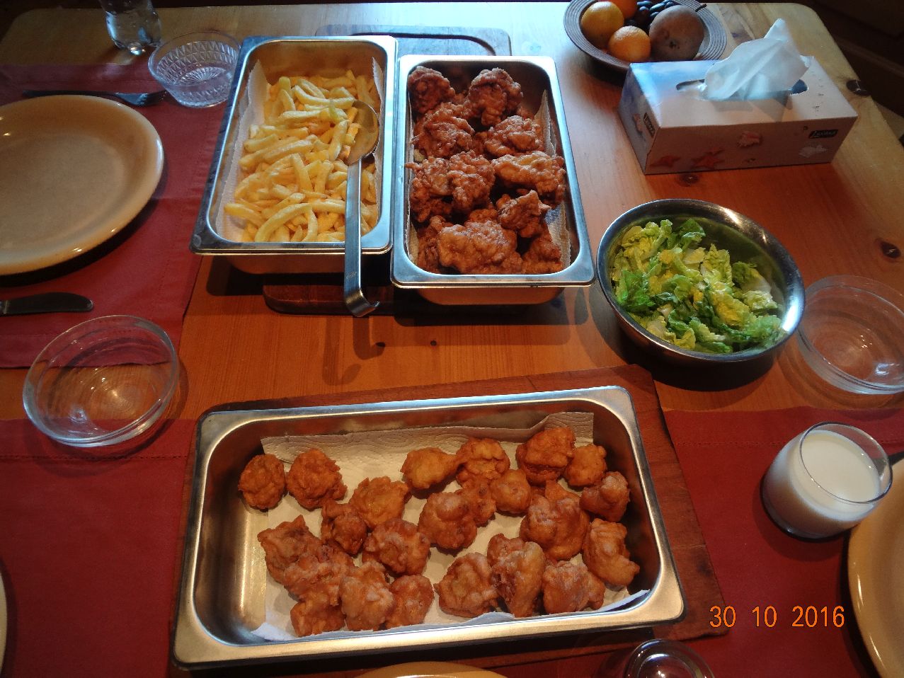 Gegrilltes Maishähnchen, Pommes frites (mit Chips-Panade), Kopf-Salat