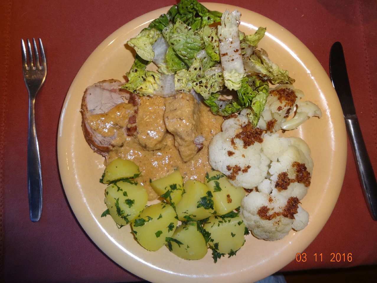 Schweine-Filet im Bacon-Mantel mit Wein-Käse-Sahne-Soße, Blumenkohl, Salat-Herzen-Salat