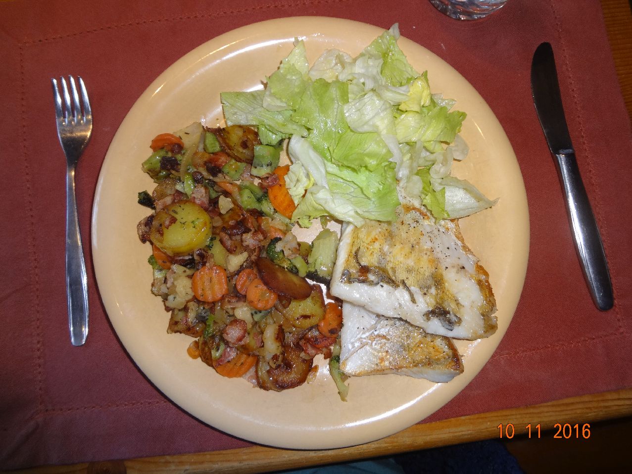 Zander-Filet und Bratkartoffeln mit Kiwi und Kaiser-Gemüse, Eisberg-Salat