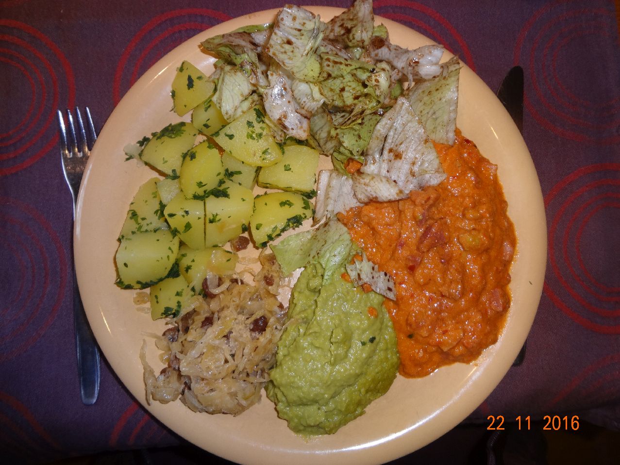 Hähnchen, Blumenkohl und Champignons im Schlafrock, selbstgemachter Kartoffel-Salat, Salat-Herzen-Salat, Möhren-Salat