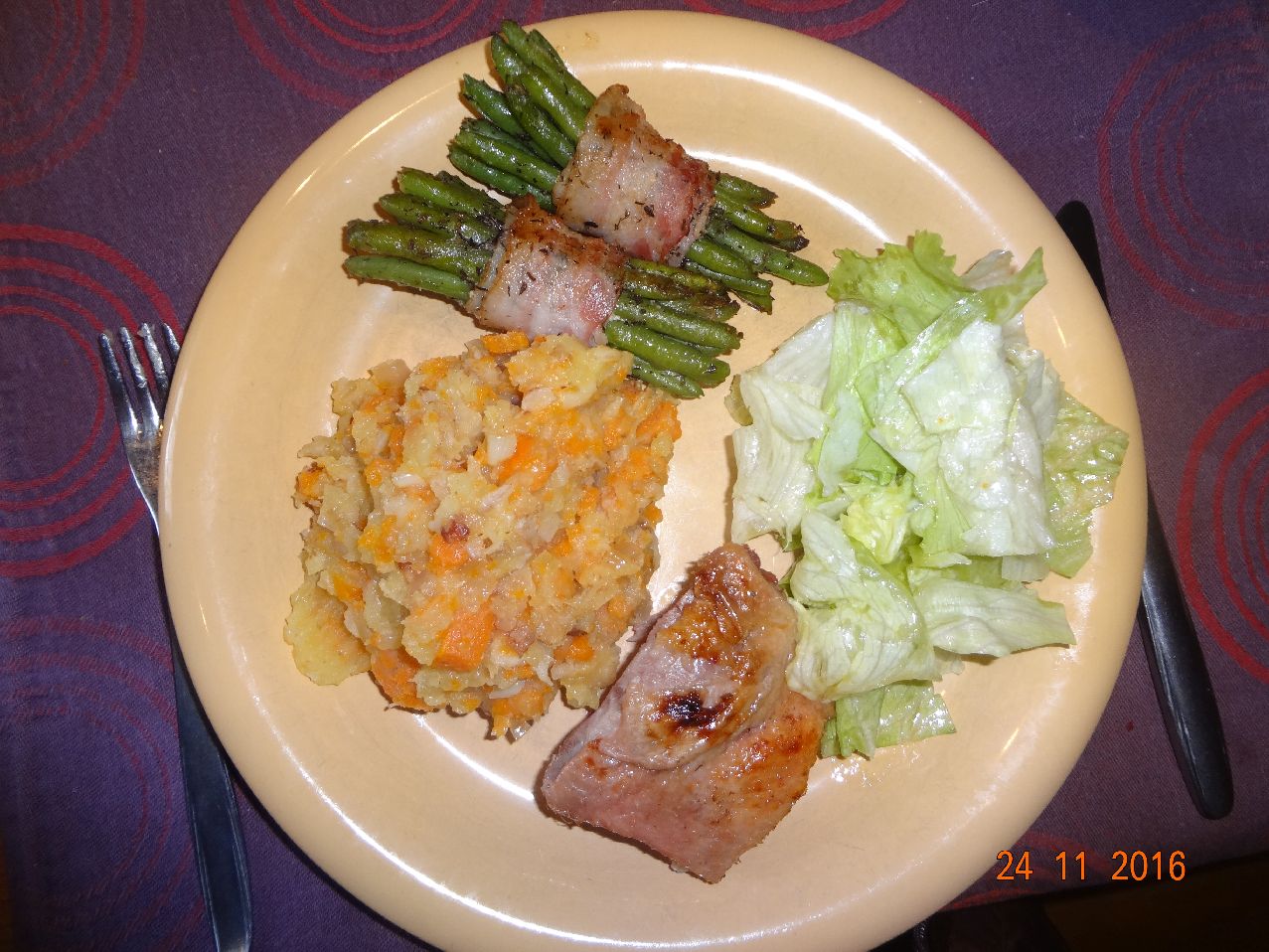 Schweine-Filet im Speck-Pesto-Mantel, Pfannen-Gemüse und RosmKart, Lettle-Gem-Salat
