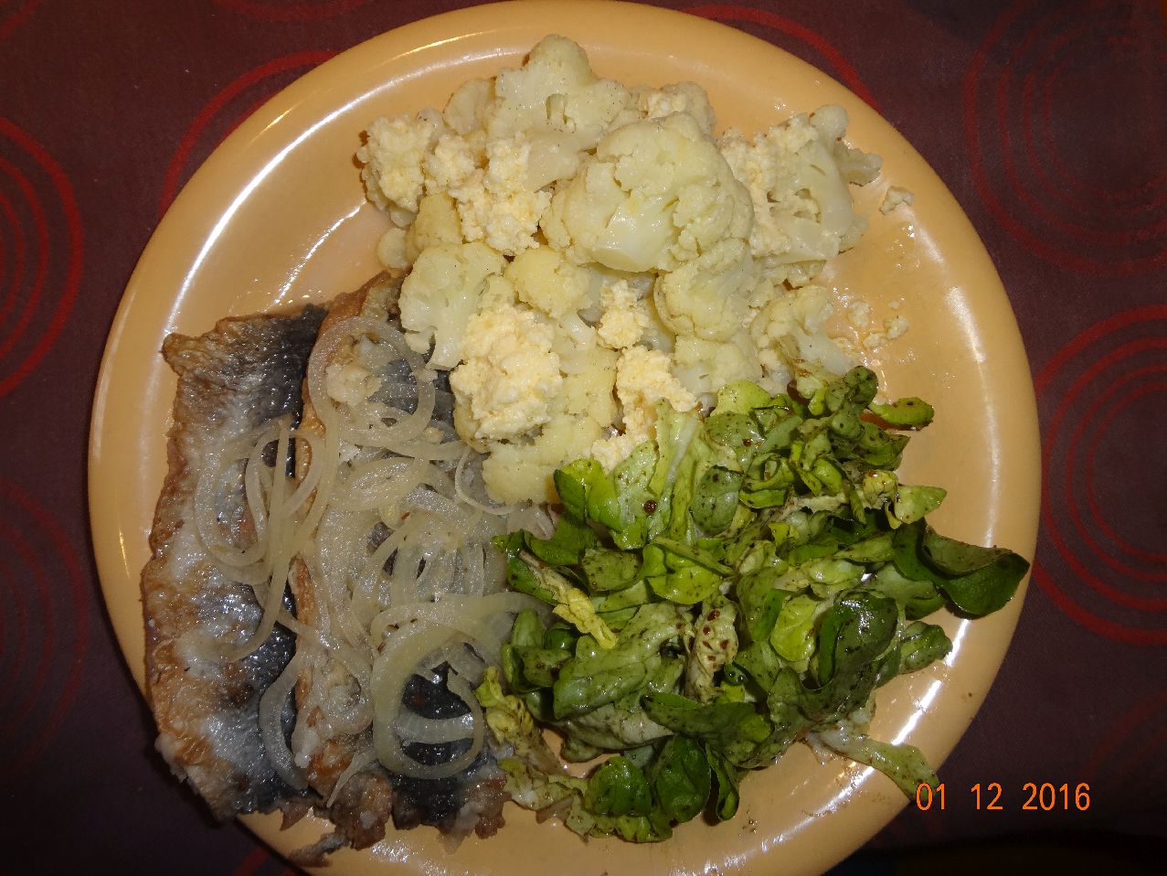 Selbstgemachte eingelegte Brathering-Filets mit Blumenkohl und Salanova-Salat