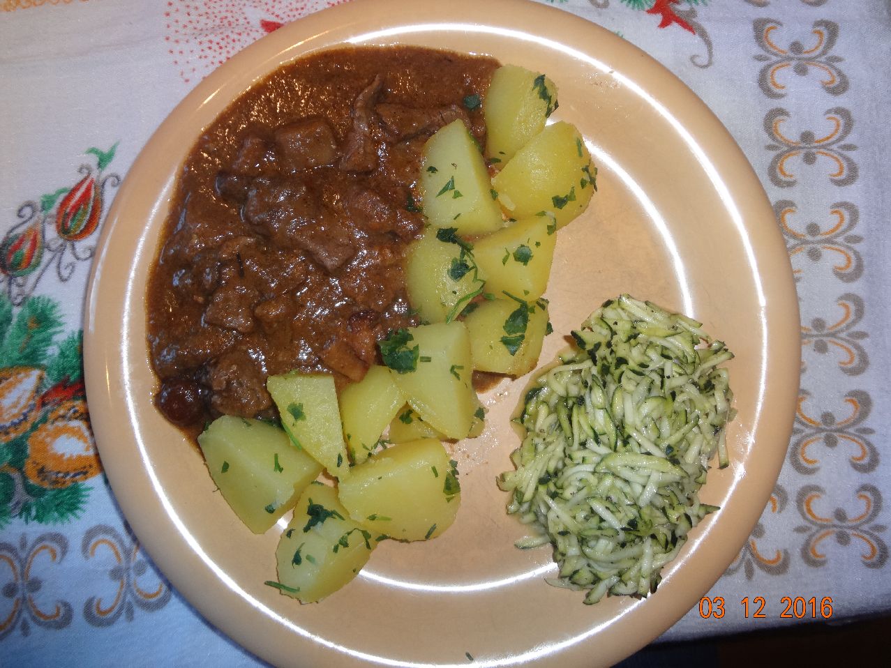 Hirsch-Gulasch mit Waldpilzen, Petersilien-Kartoffeln und Zuccini-Salat