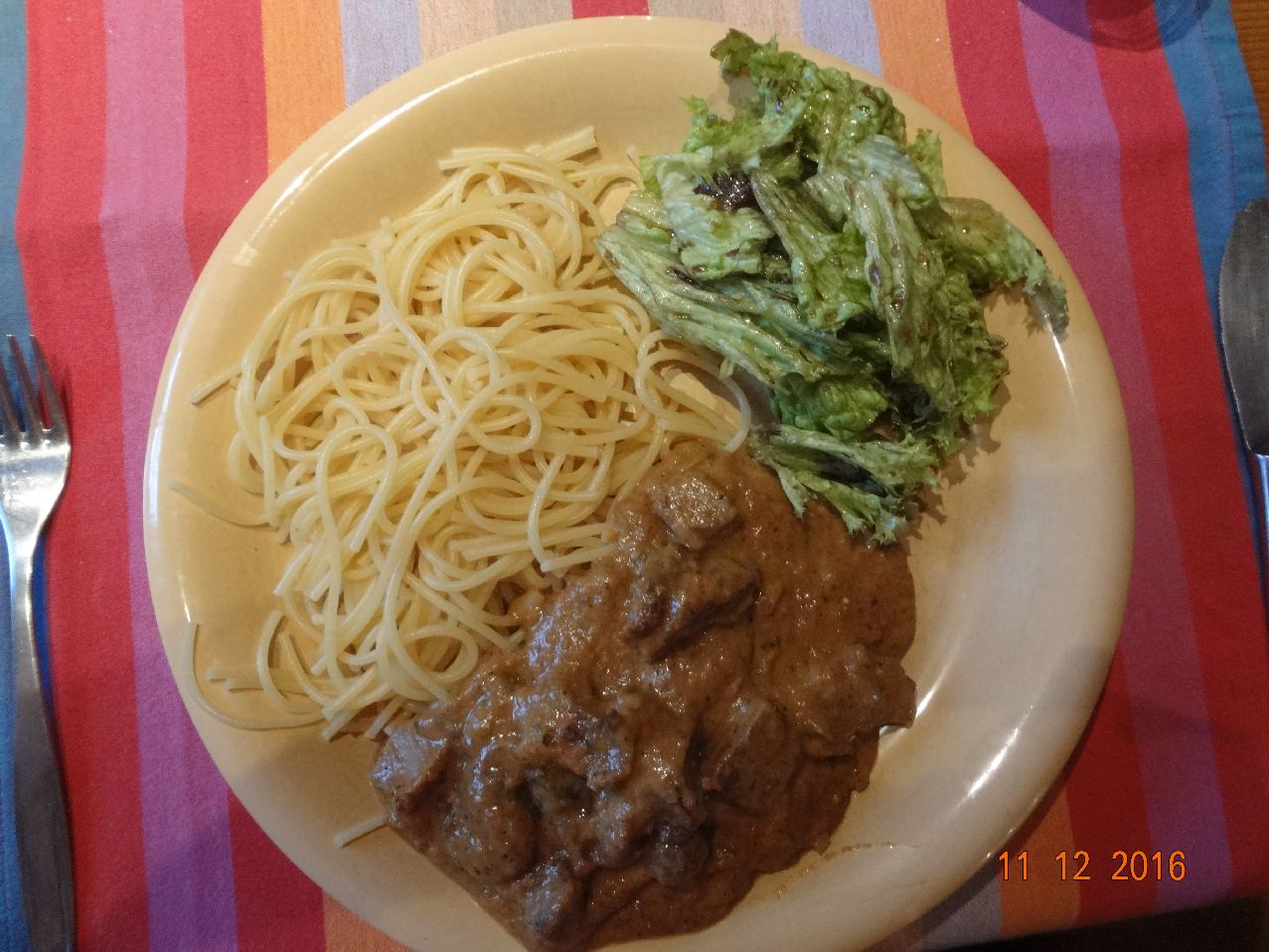 Rinder-Gulasch mit Pilzen und Spaghetti, Lollo-Bionda-Salat