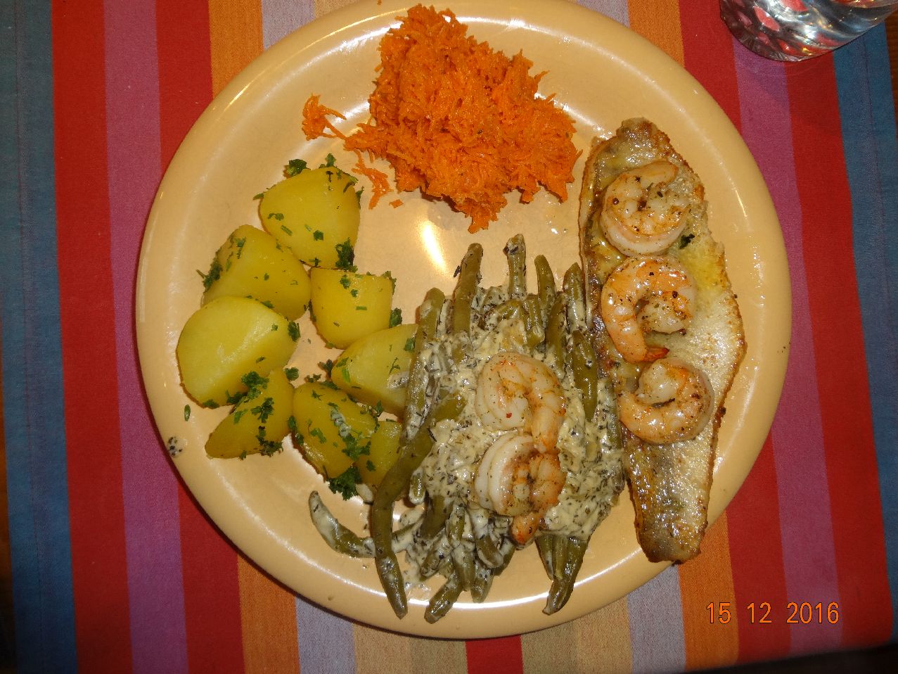 Zander-Filet* und Garnelen* mit grünen Bohnen in Kräuter-Butter und mit Sahne-Soße, Thymian-Kartoffeln und Möhren-Salat