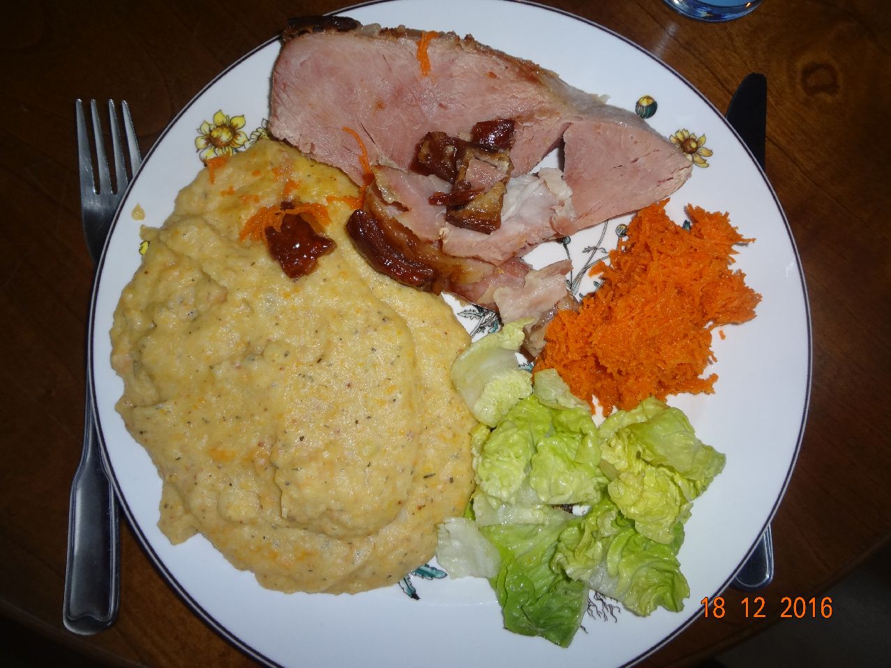 Krusten-Braten (über Nacht im Backofen) mit Kartoffel-Karotten-Sellerie-Püree, Möhren-Salat und Salat-Herzen