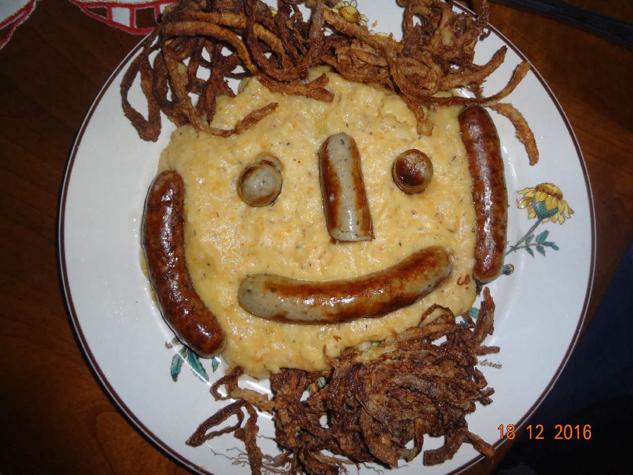 Gesicht aus Landnudeln, Würstchen und Gemüse-Püree-Soße
