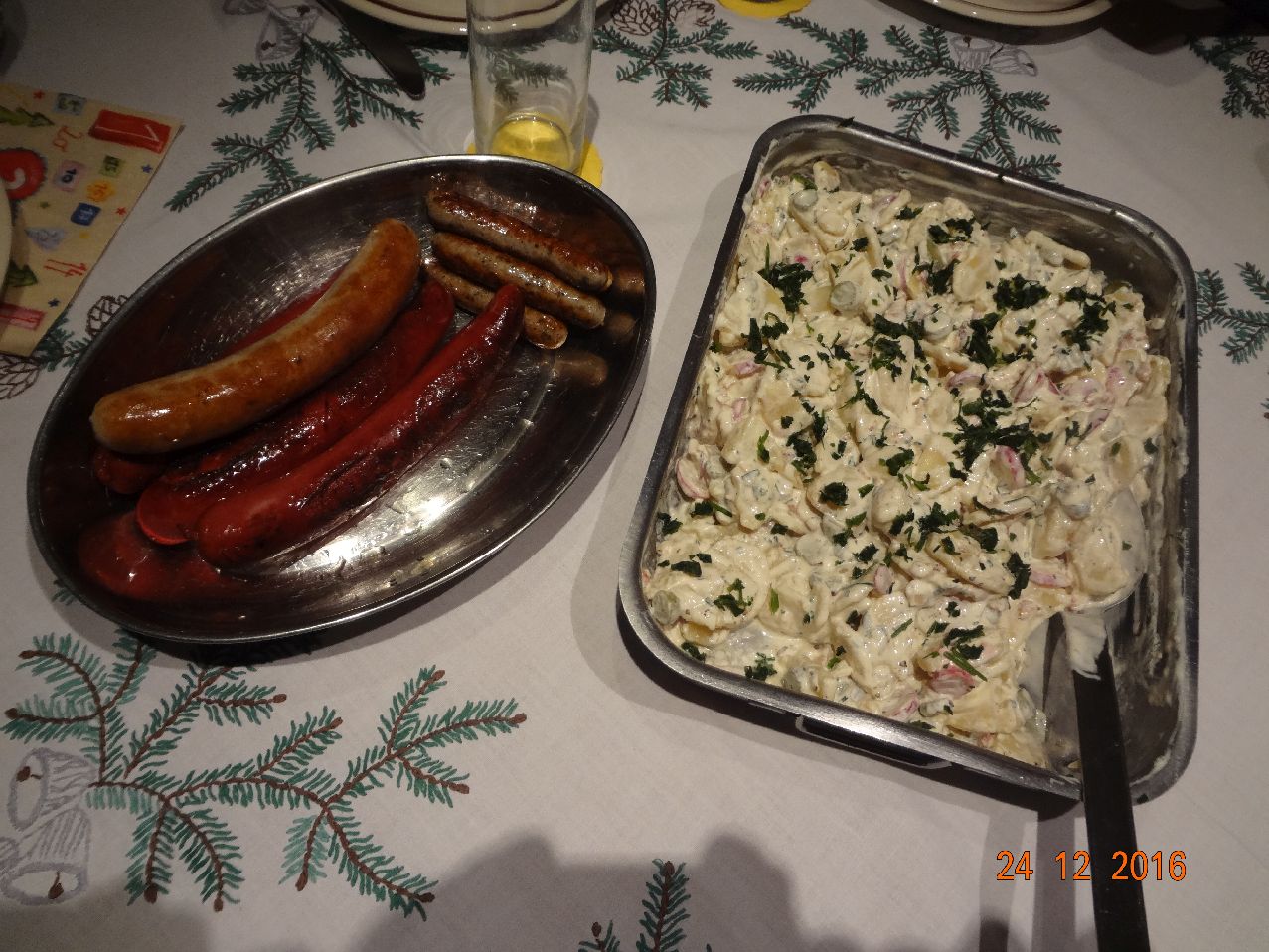 Kartoffel-Salat (mit Radieschen) und gebratene Würstchen