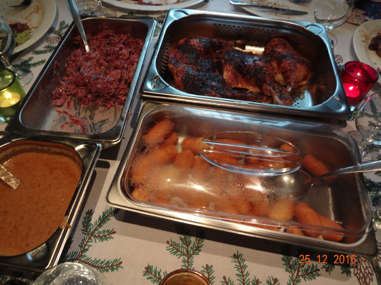 Enten-Keulen, Rotkohl und Kartoffel-Kroketten, Erdbeeren mit Super-Vanille-Soße