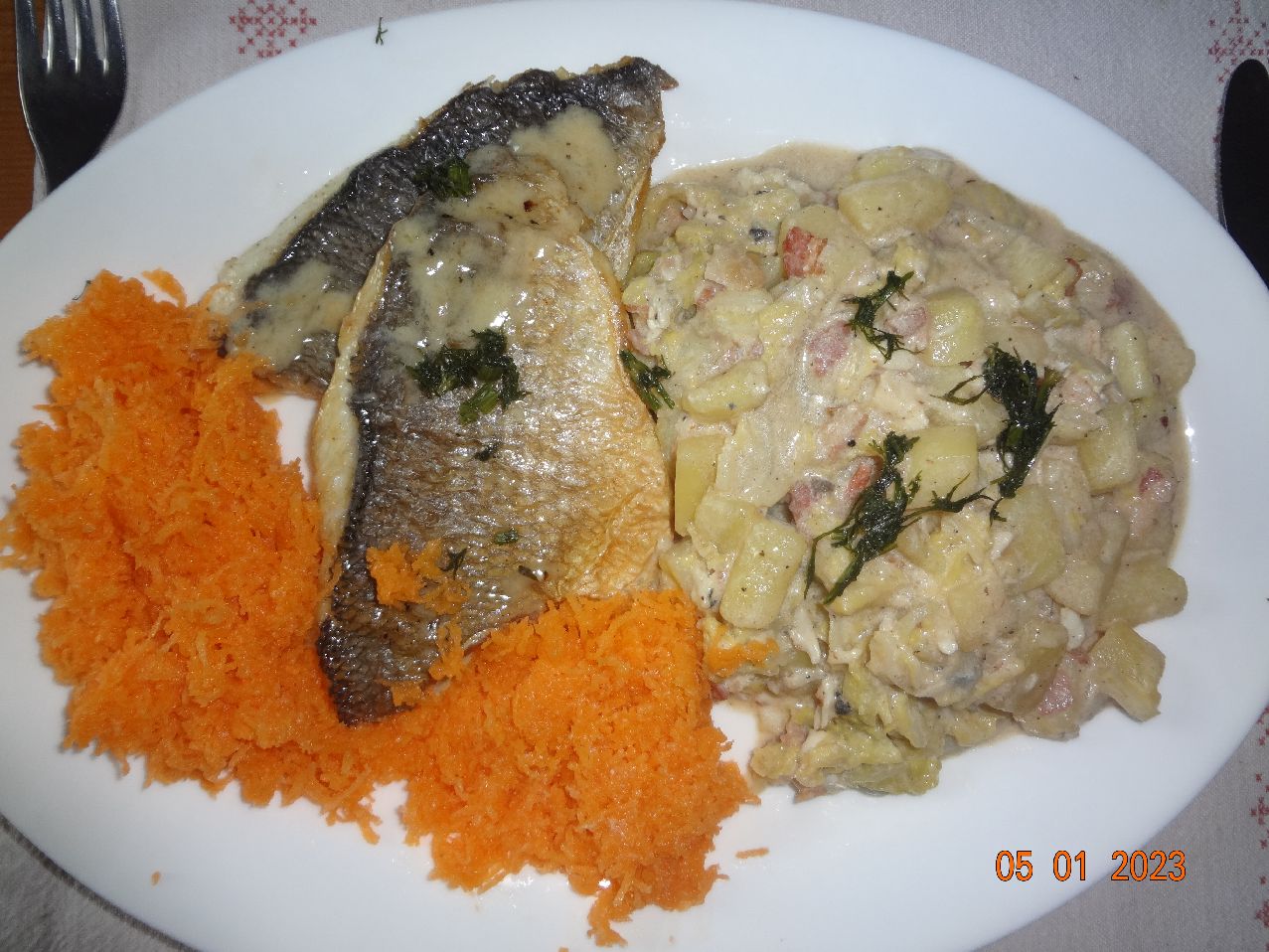 Fisch, Bratkartoffeln mit Speck, Zwiebeln, Champignon, Möhrensalat, Dip aus Schmand, Ajvar, Tomatenmark, Ahornsirup