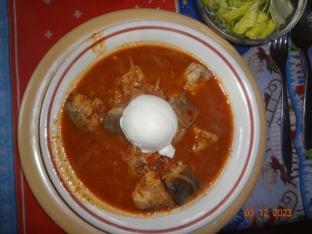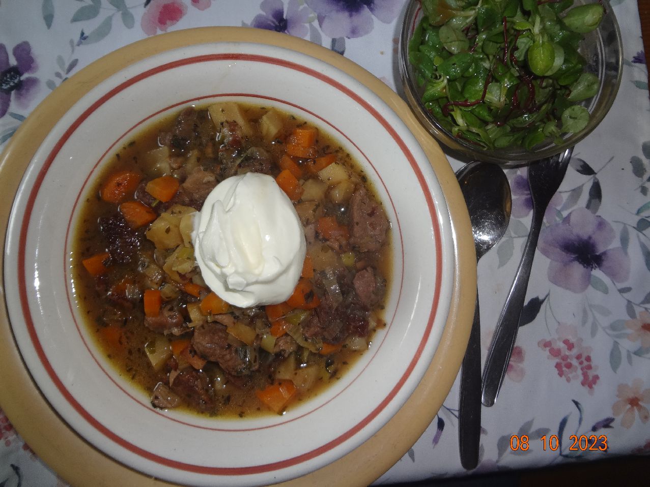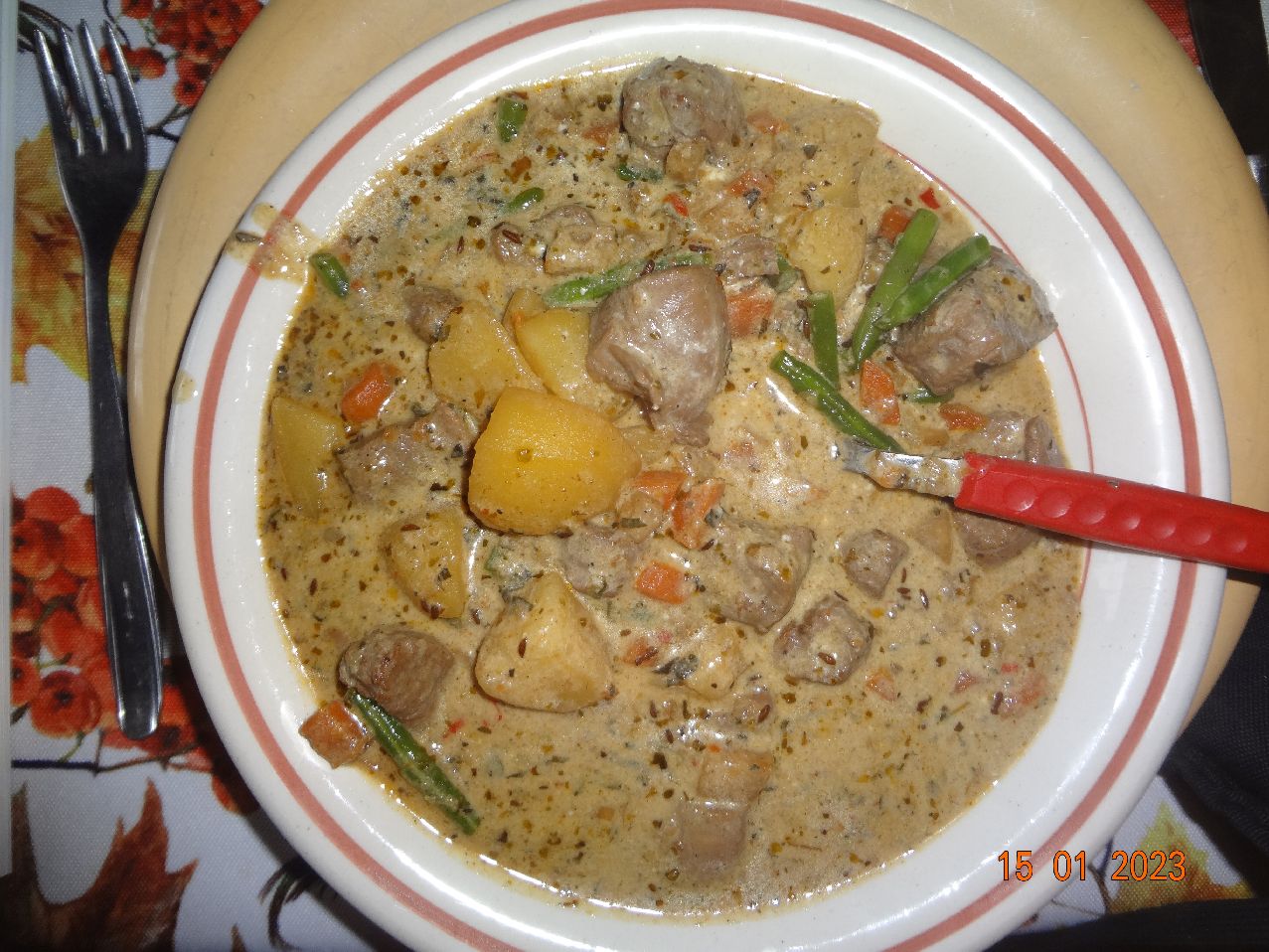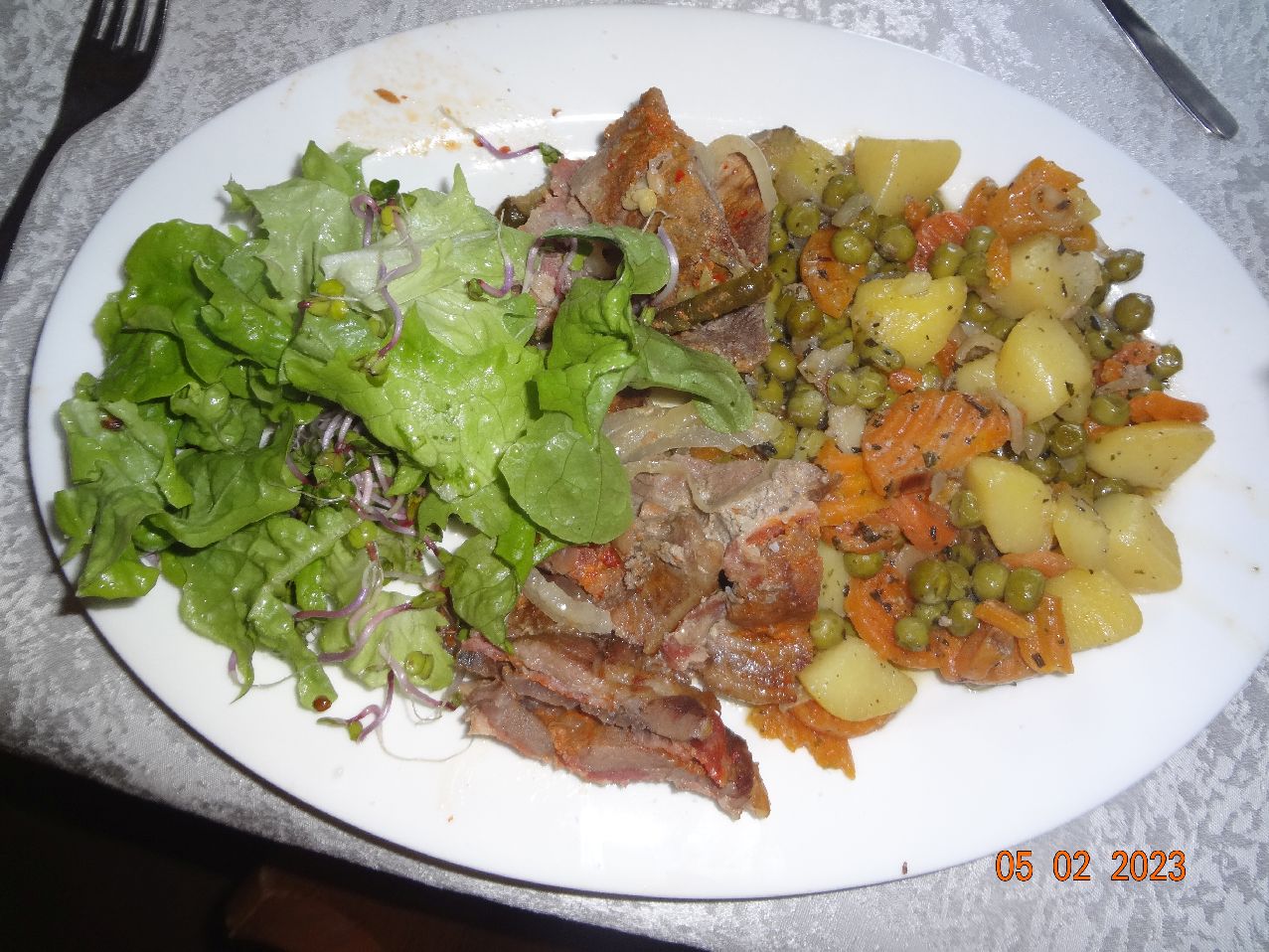 Lamm-Gulasch mit Möhren, Sellerie, Bohnen, Kartoffeln, Salat wie gestern