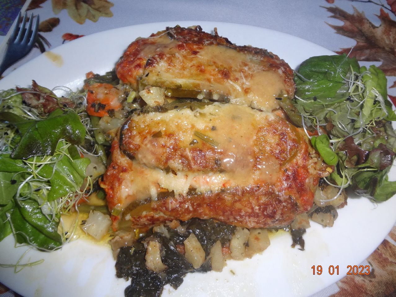 Gemüse-Auflauf, italienisches Schlemmer-Filet, Eichblattsalat mit Sprossen