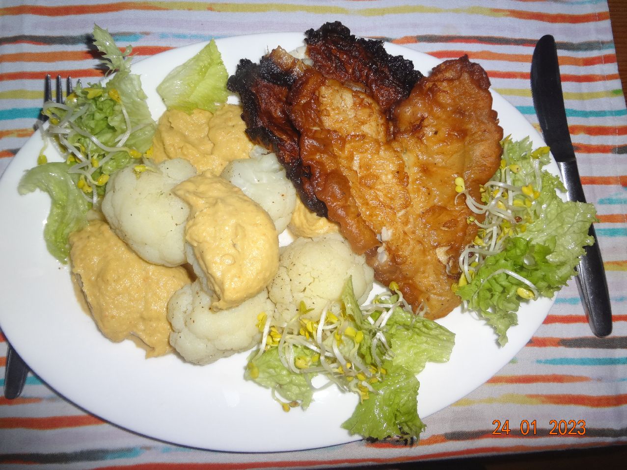 Scholle im Schlafrock(*), Blumenkohl mit Gemüse-Creme(*), Lollo-Bionda-Salat mit Radieschen-Sprossen