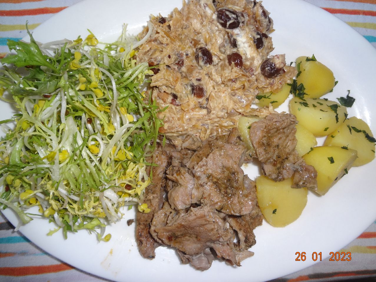 Räuber-Braten mit Rum-Rosinen, Sauerkraut, Pet.-Kart., Lollo-Rosso-Salat mit Radieschen-Sprossen