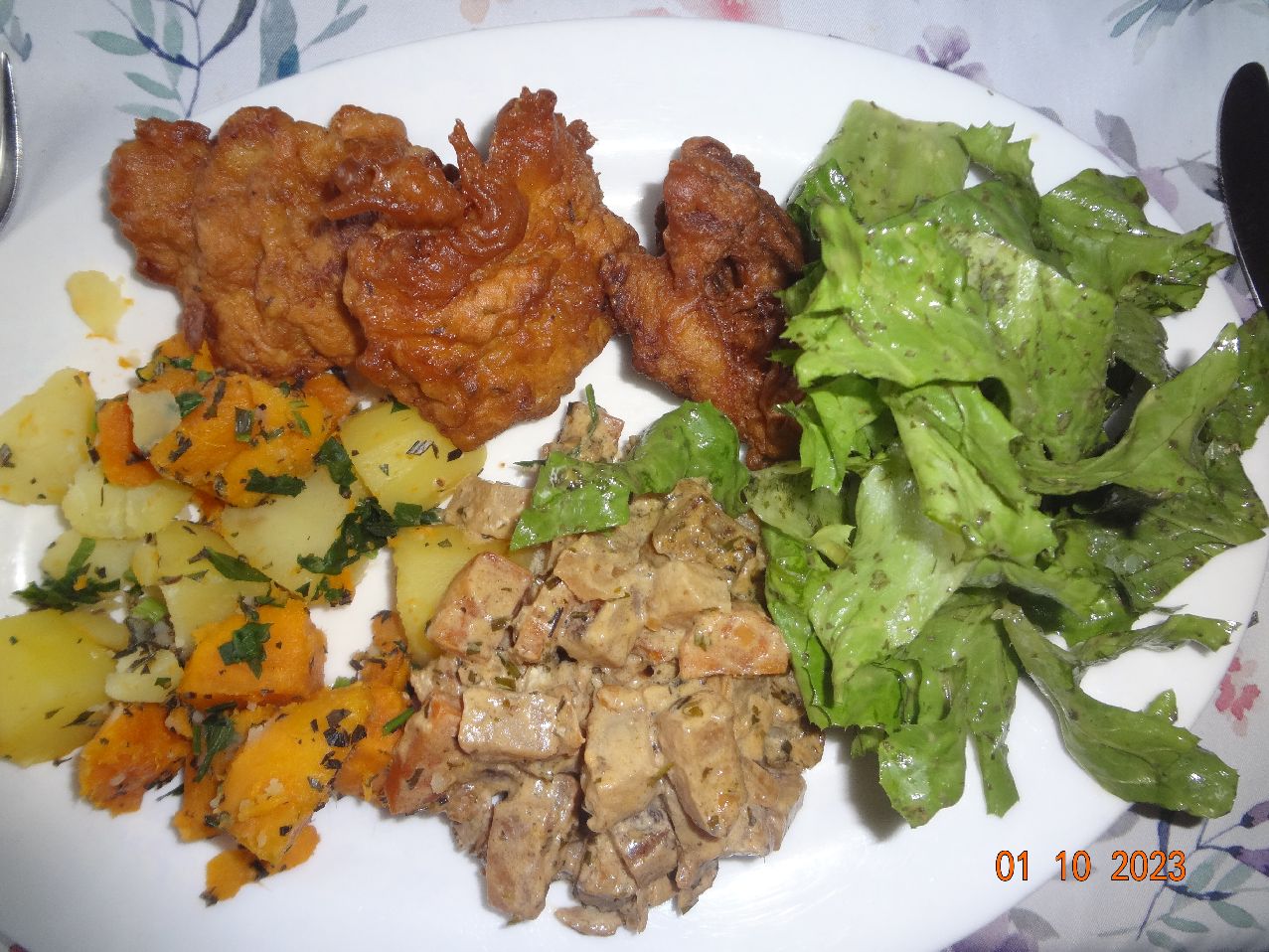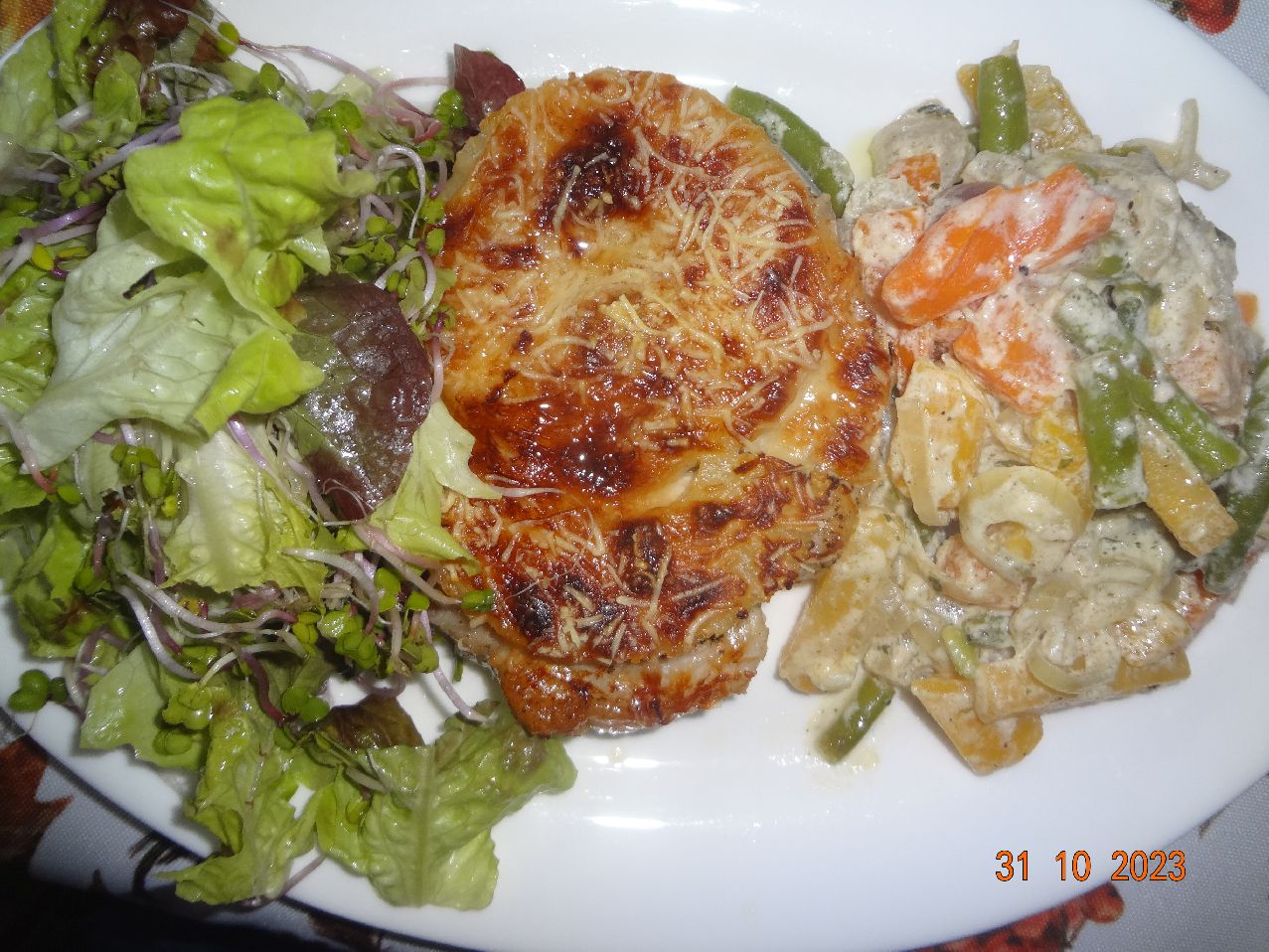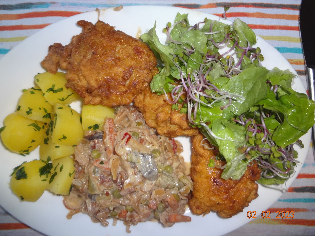 Panierte Schweine-Medaillons, Mischgemüse, Pet.-Kart., Mini-Romana-Salat mit China-Rose-Sprossen