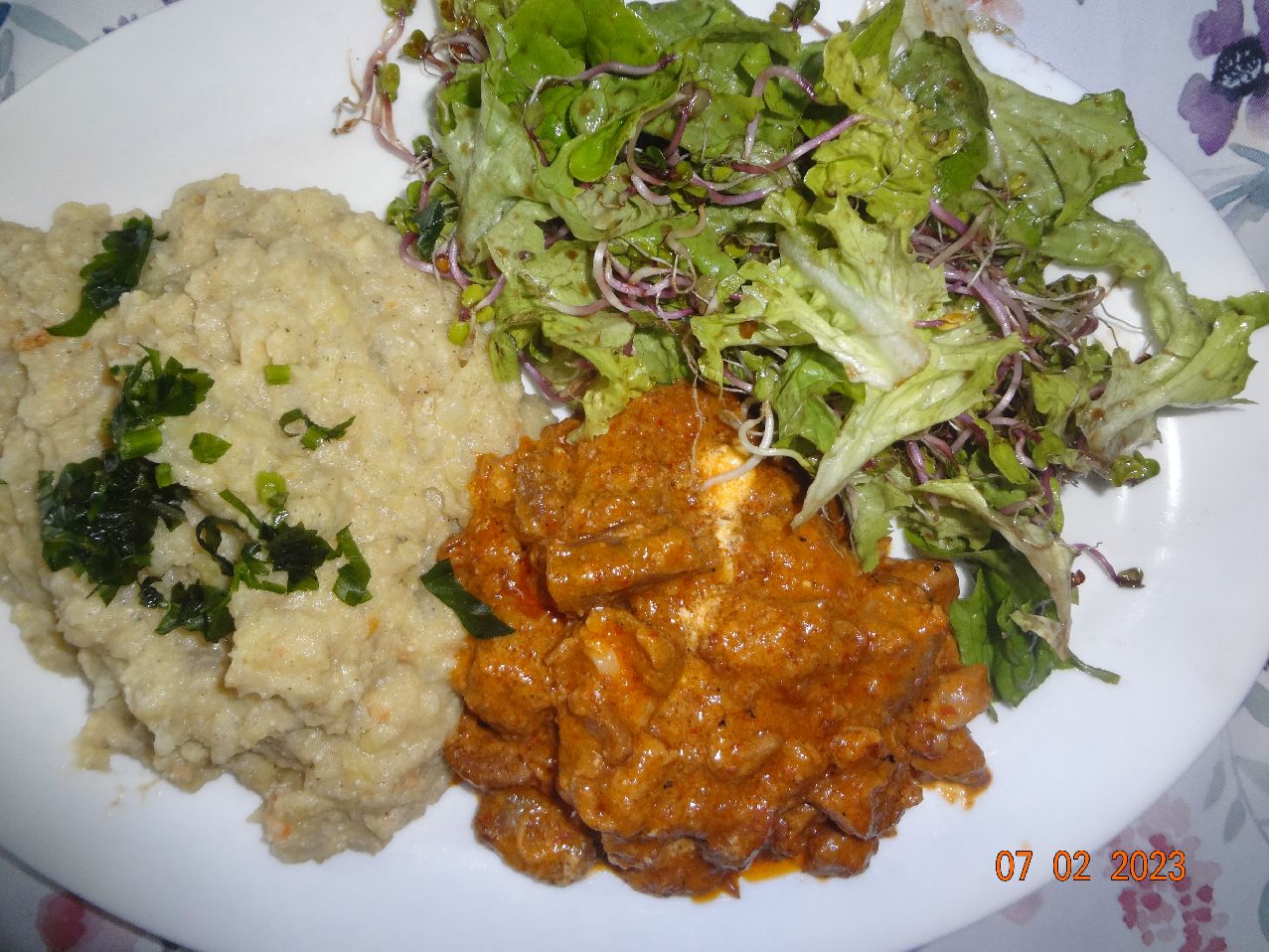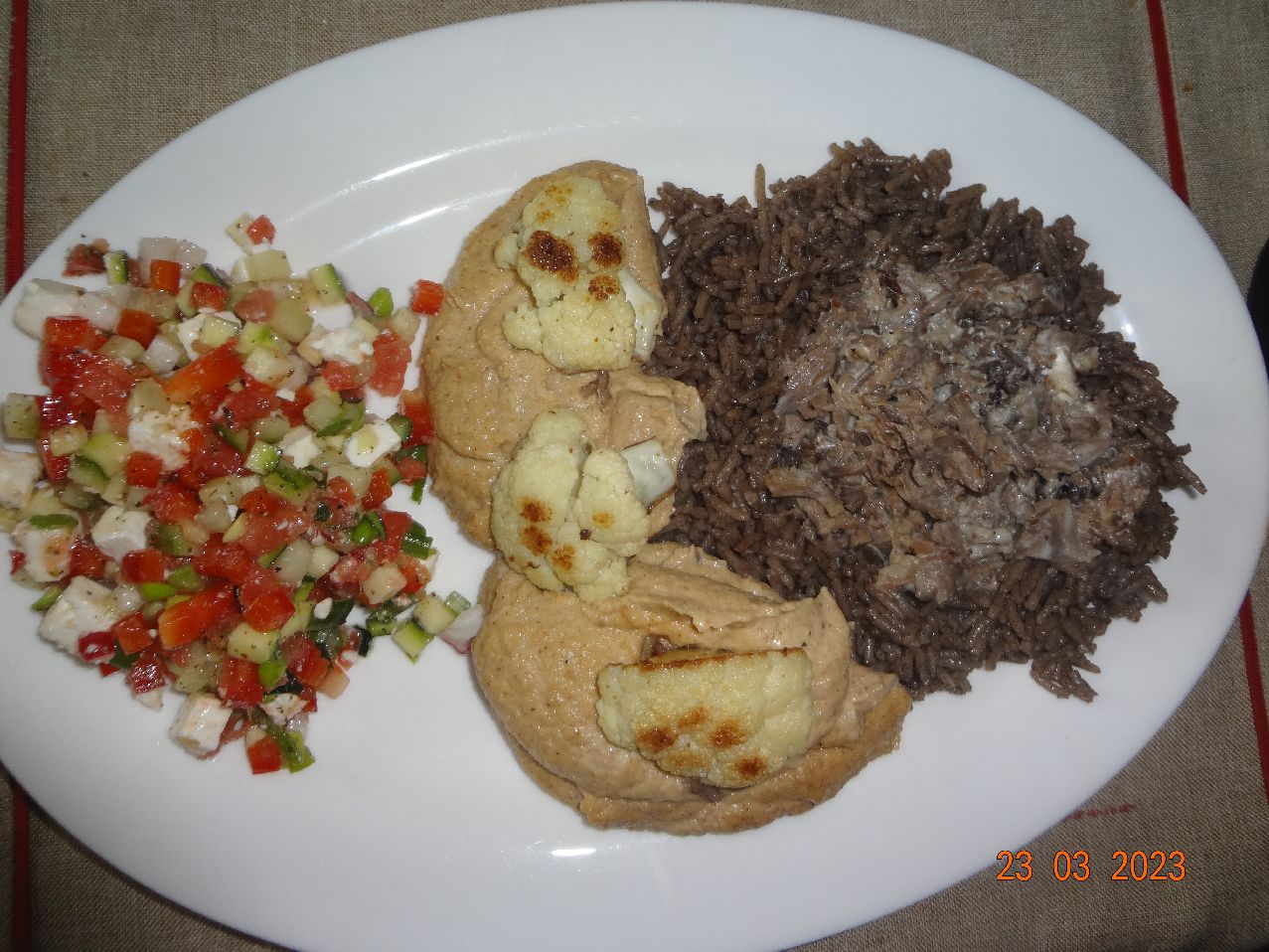 In Brühe gegarter Basmatireis, Rindfleisch-Ragout, Blumenkohl-Püree(-), Gemüse-Feta-Salat