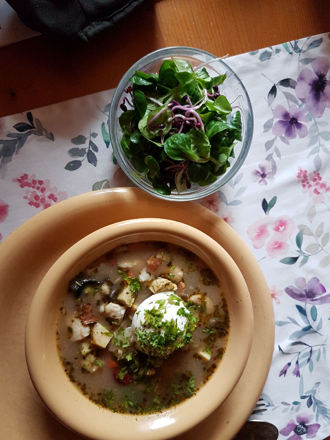 Karpfen-Suppe, Lollo-Bionda-Salat mit Kräutern