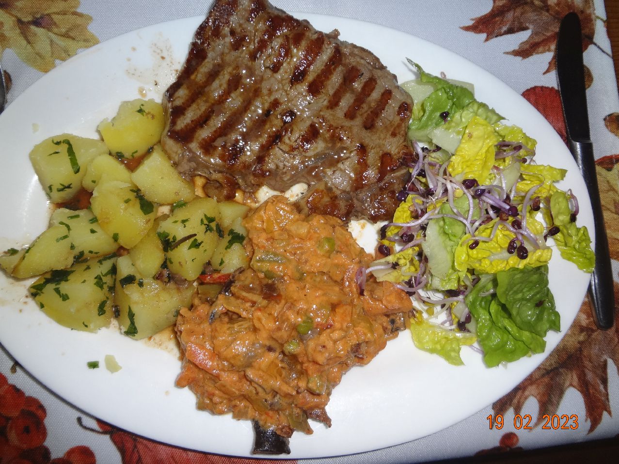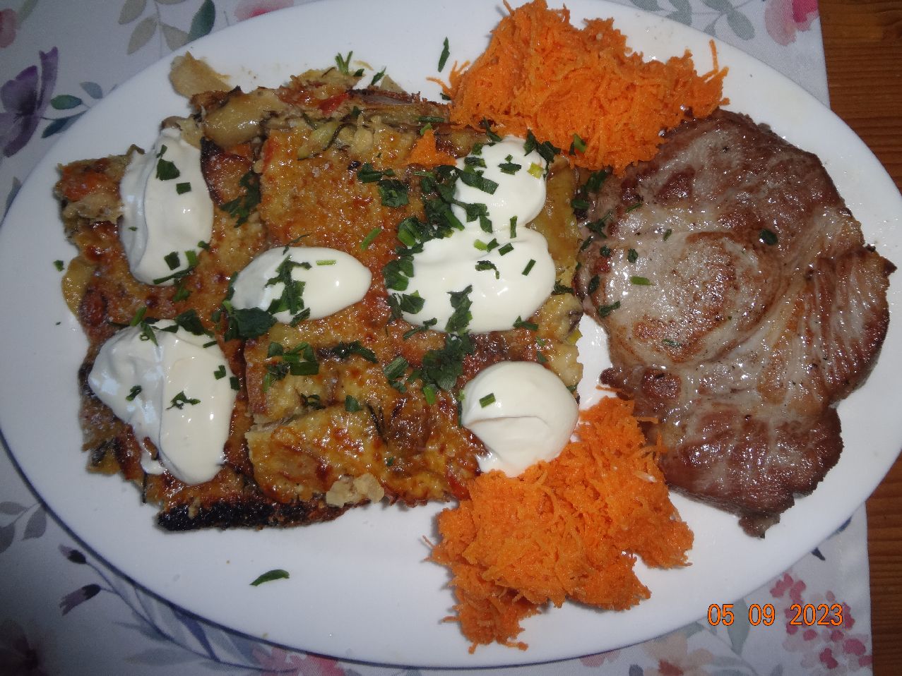Allerlei-Gemüse-Auflauf mit süßer Creme, Nackensteak, Möhrensalat