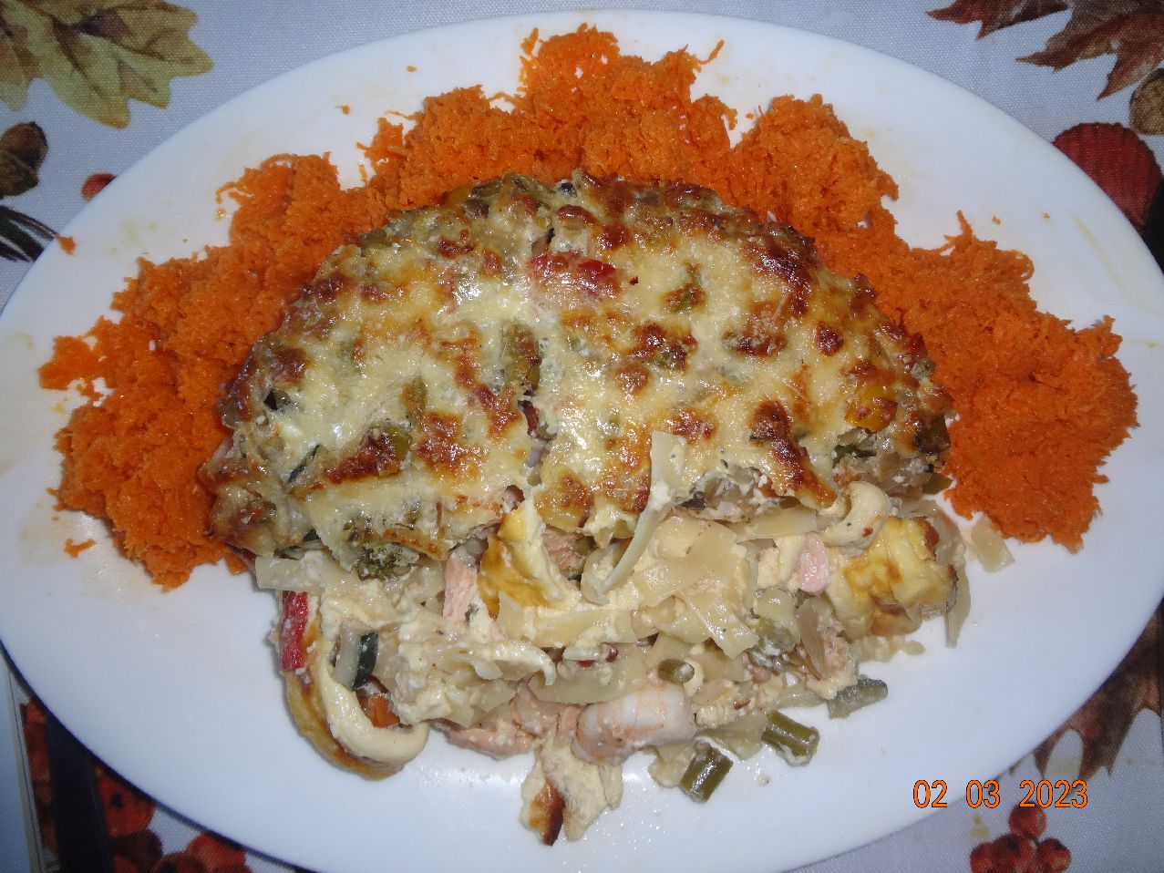 Lachs-Garnelen-Auflauf(*) mit italienischem Pfannen-Gemüse, Tagliatelle, Möhrensalat