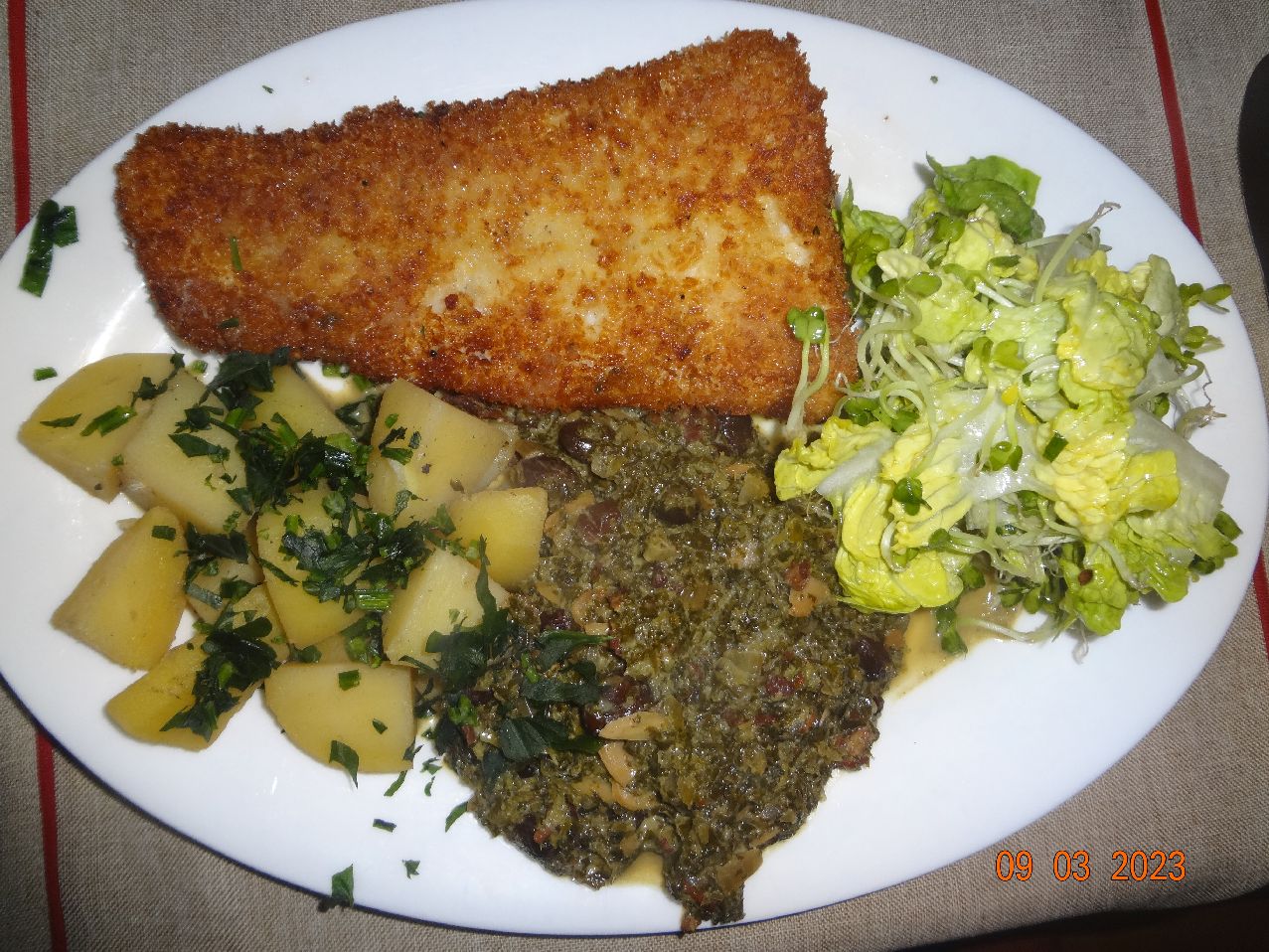 Paniertes Kabeljau-Filet, Grünkohl mit Rosinen, Mandeln, Pet.-Kart. in Brühe gekocht, Salatherzen mit Radieschen-Sprossen