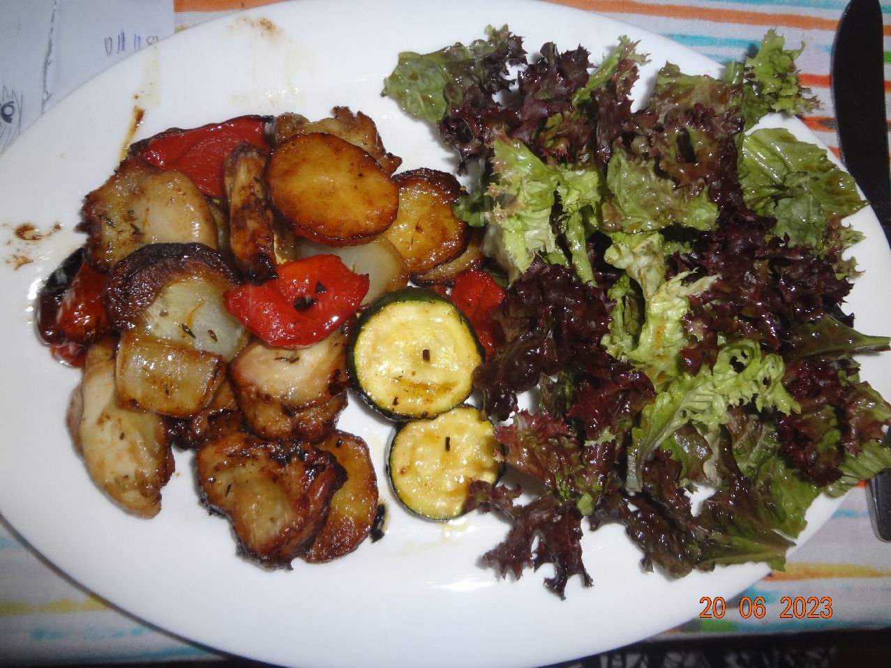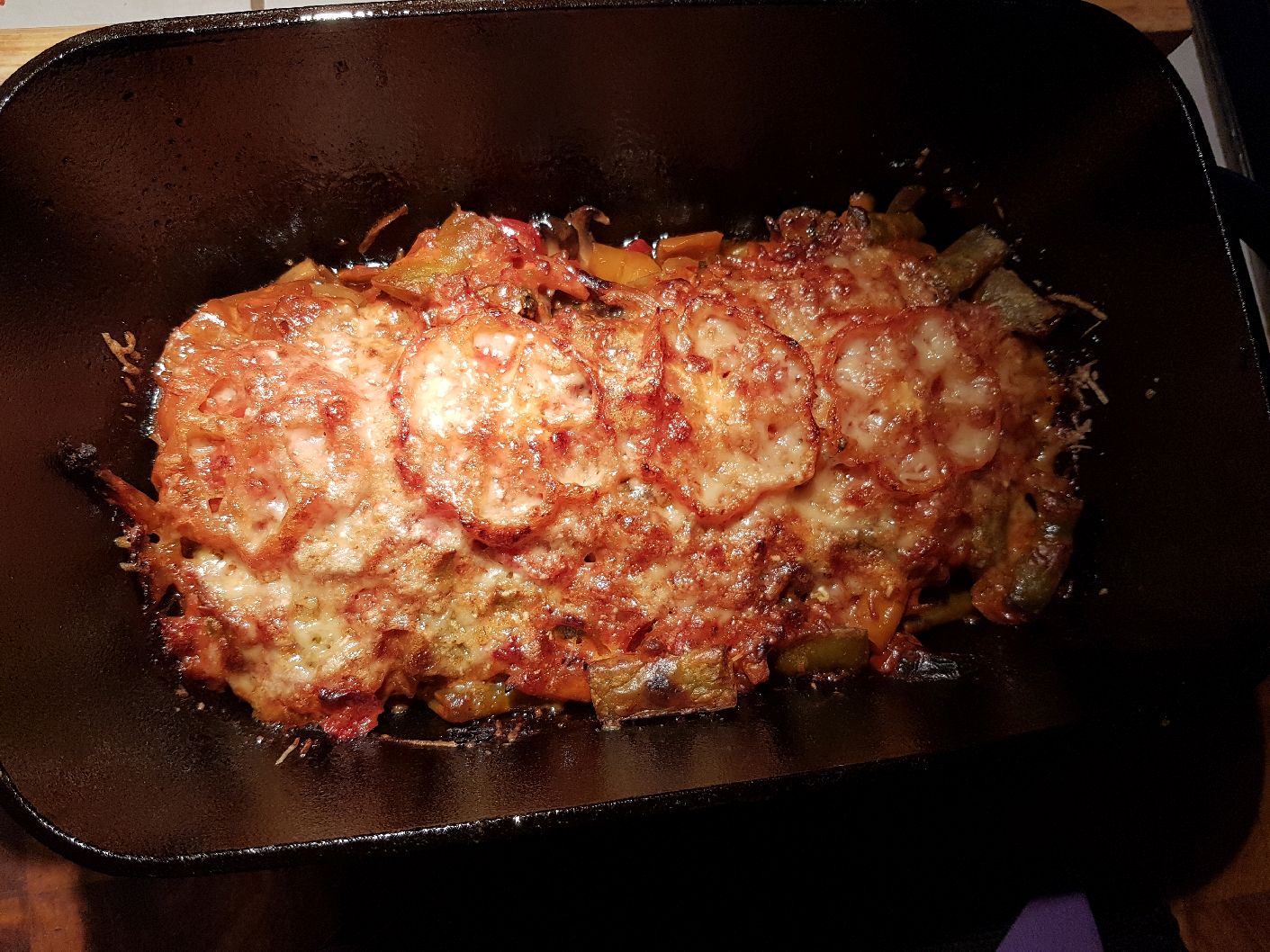 Hähnchen-Gemüse-Schichtbraten(**) (Hähnchenfleisch, Spinat, Bohnen, Möhren, Sellerie, saure Gurken, Käse, Kräuter, Zwiebeln, Ajvar, Schmand im gußeisernen Bräter), Eichblatt-Salat mit Alfalfa-Sprossen)