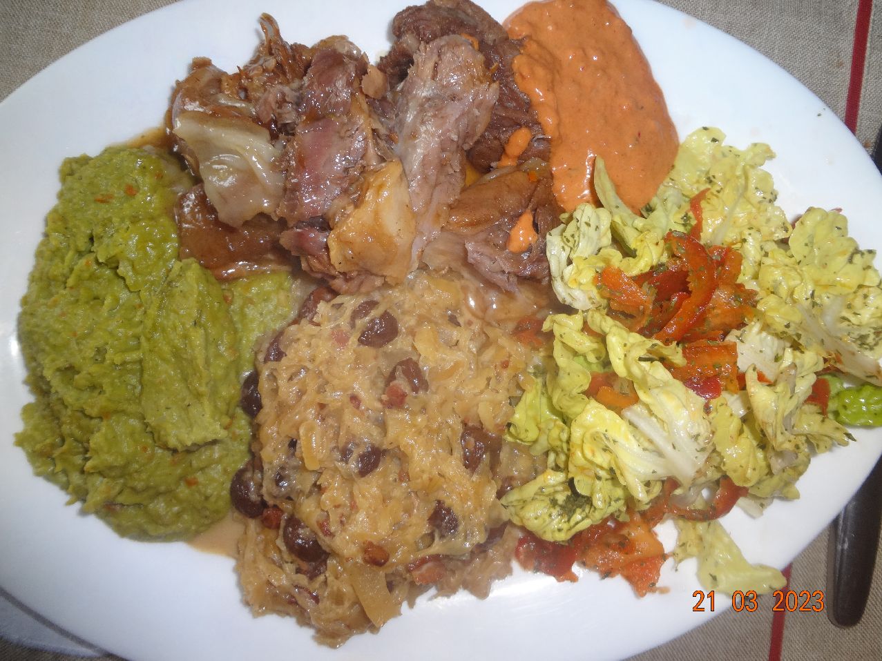 Eisbein mit Rum-Rosinen-Apfel-Sauerkraut, Erbsen-Püree, Eisbergsalat mit Paprika