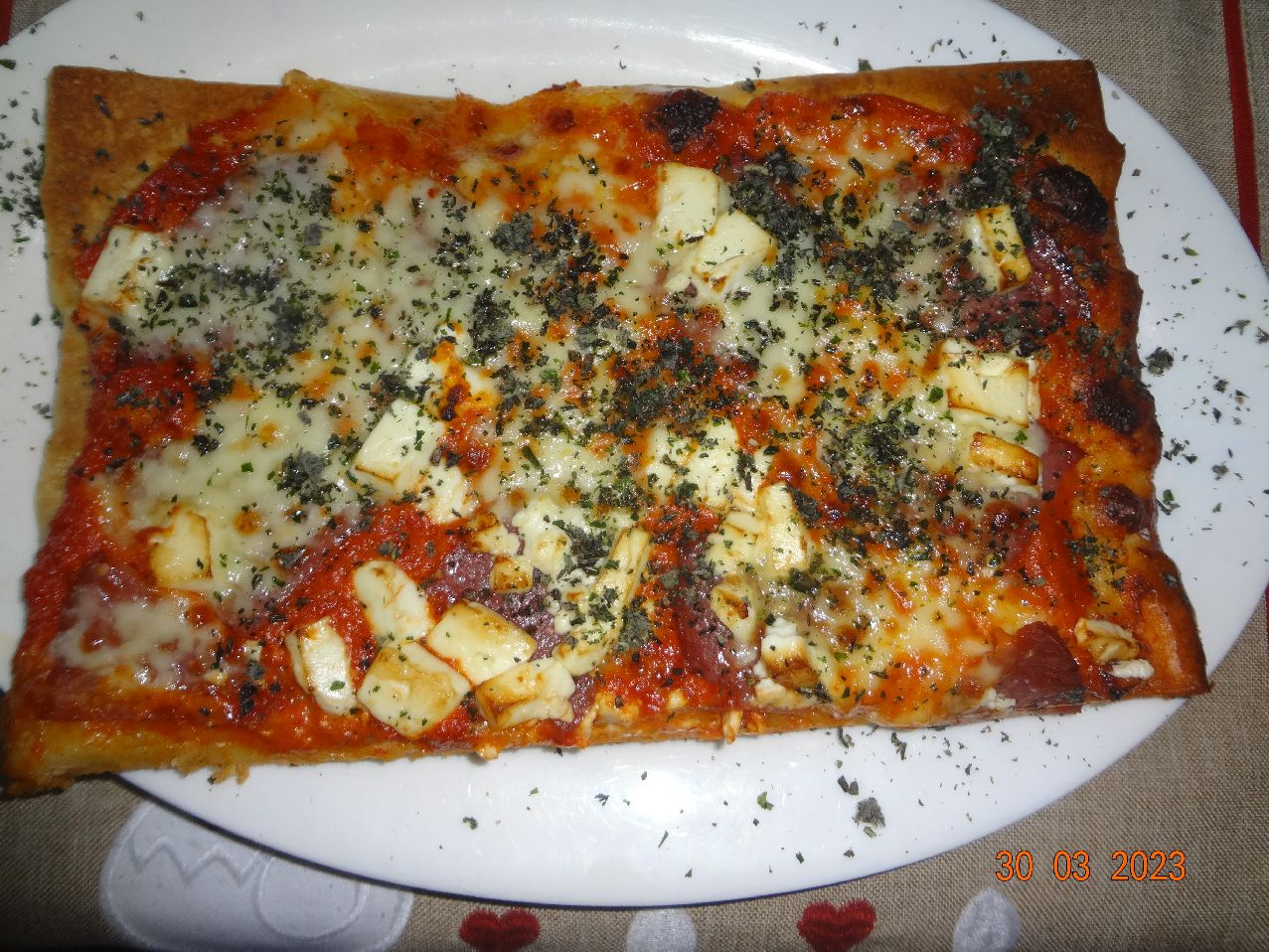 Mit Feta gefüllte Frikadellen, Bratkartoffeln mit Asia-Gemüse, schwarzen Oliven, Lollo-Bionda-Salat