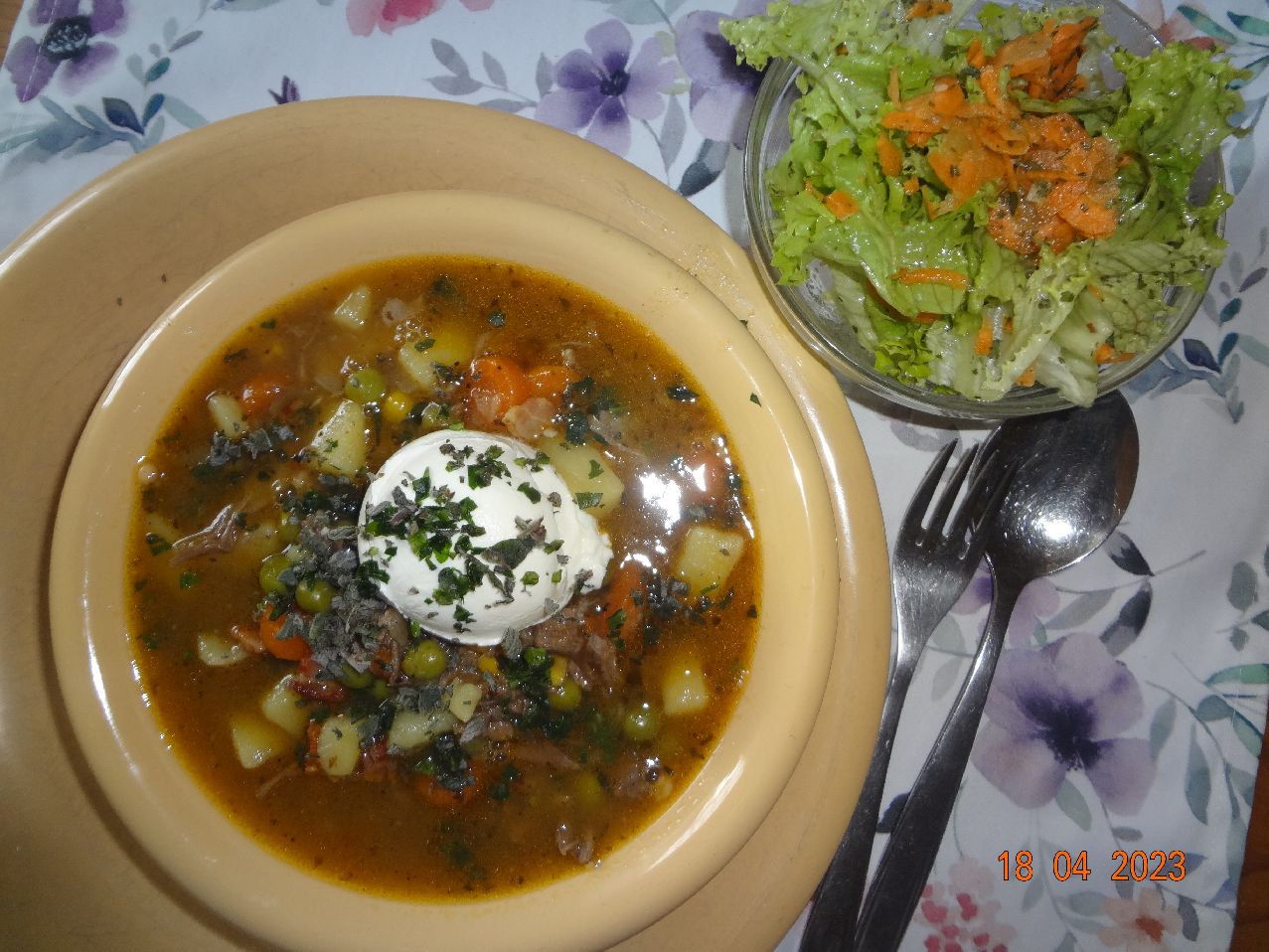 Gemüse-Eintopf mit Fleisch vom Jungochsen, Lollo-Bionda-Salat mit gehobelten Möhrchen