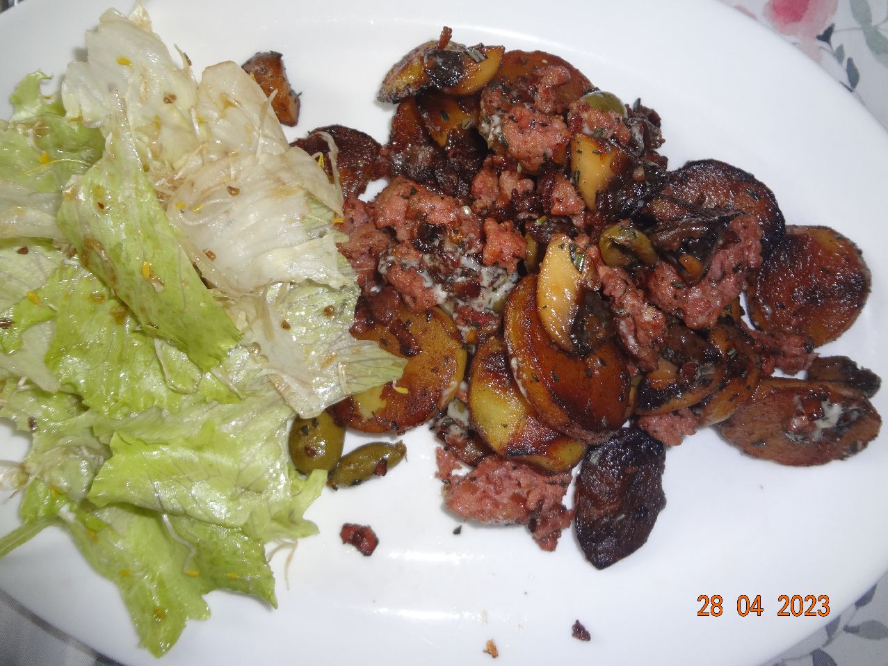 Mediterrane Bratkartoffeln mit Salsiccia, Eisbergsalat mit Alfalfa Sprossen