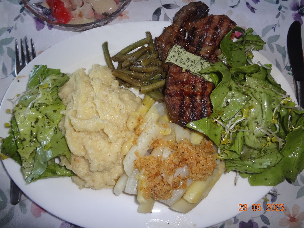 Entrecôte vom Angus-Rind, Spargel, grüne Bohnen, Kartoffel-Sellerie-Stampf, Kopfsalat mit Kräutern, Sprossen