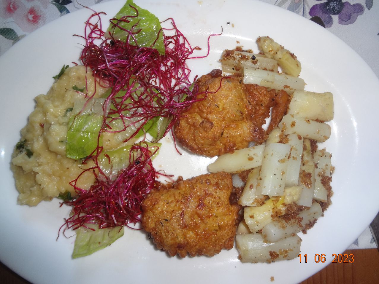 Vorbereitet für den 1. Mai: Kartoffeln mit Sellerie, marinierte Hähnchen-Oberschenkel(5kg Spargel, in Nussbutter)