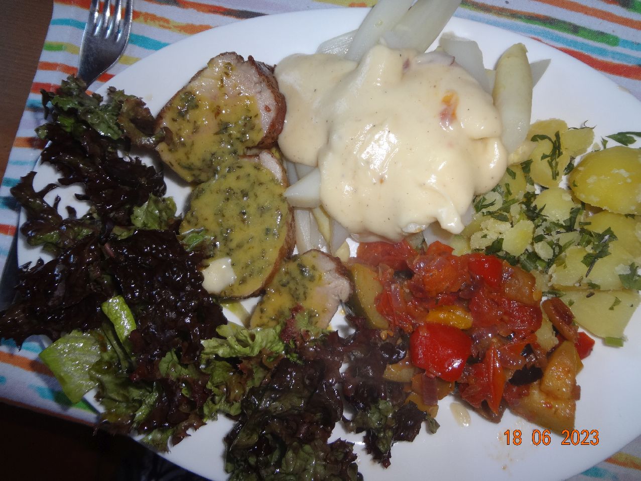 Schweine-Filet vakuum-gegart, Spargel mit Bechamel-Soße, spanisches Grill-Pfannen-Gemüse(*), Pet.-Kart., Lollo-Rosso-Salat mit Leinöl