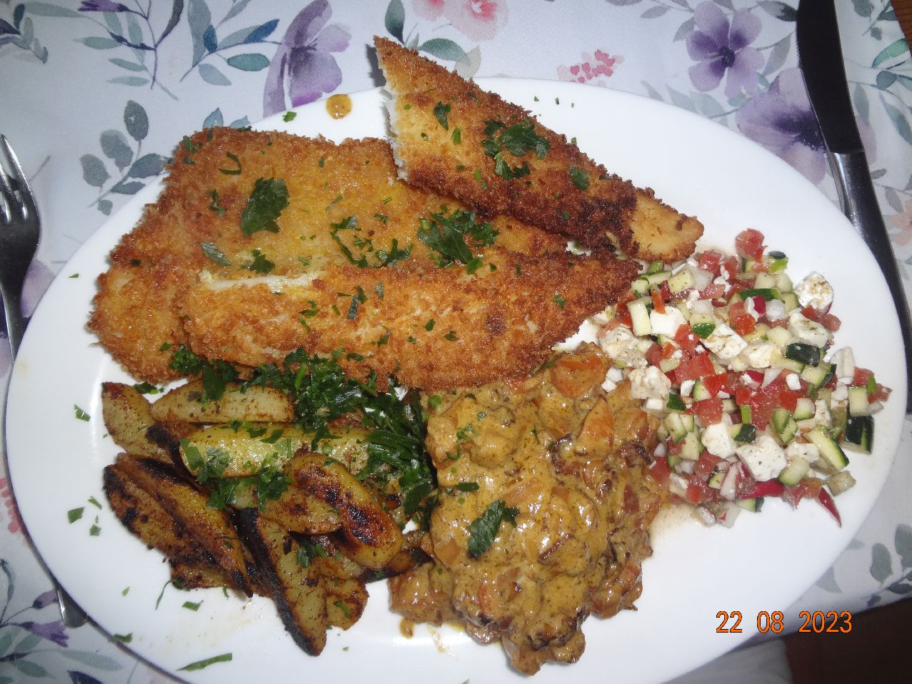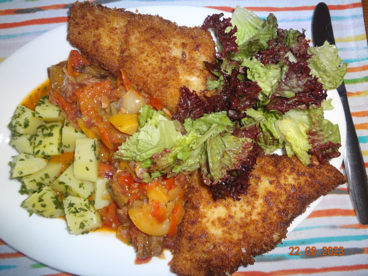 Paniertes Wolfsbarsch-Filet in Wein-Schmand-Soße, französisches Pfannen-Gemüse, Pet.-Kart., Gemüse-Feta-Salat