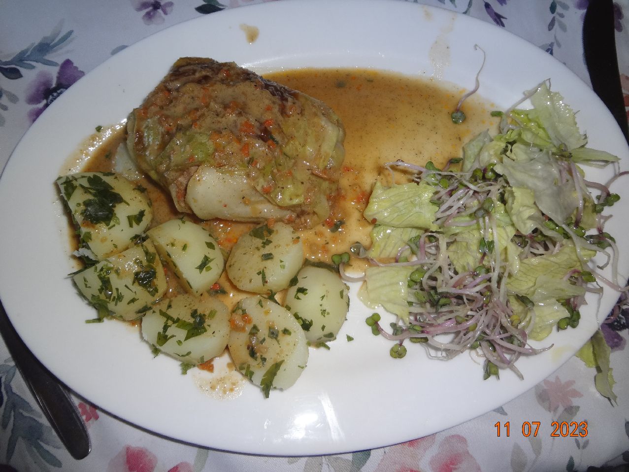 Wirsingkohl-Rouladen, Pet.-Kart., Eisbergsalat mit Kräutern