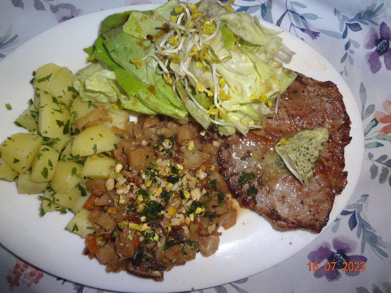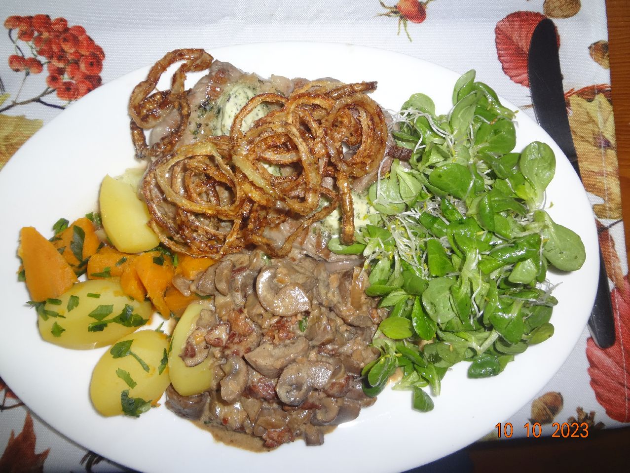Entrecôte mit fritierten Zwiebeln, Champignons in Wein-Schmand-Soße, Süß-, Pet.-Kart., Feldsalat mit Alfalfa-Sprossen