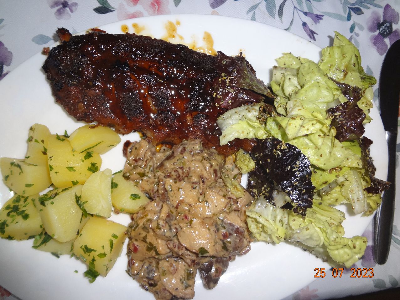 Schälrippchen, Shiitake-Pilze in Schmand-Wein-Soße, Pet.-Kart., Kopfsalat mit Pflücksalat und Kräutern der Provence, Leinöl