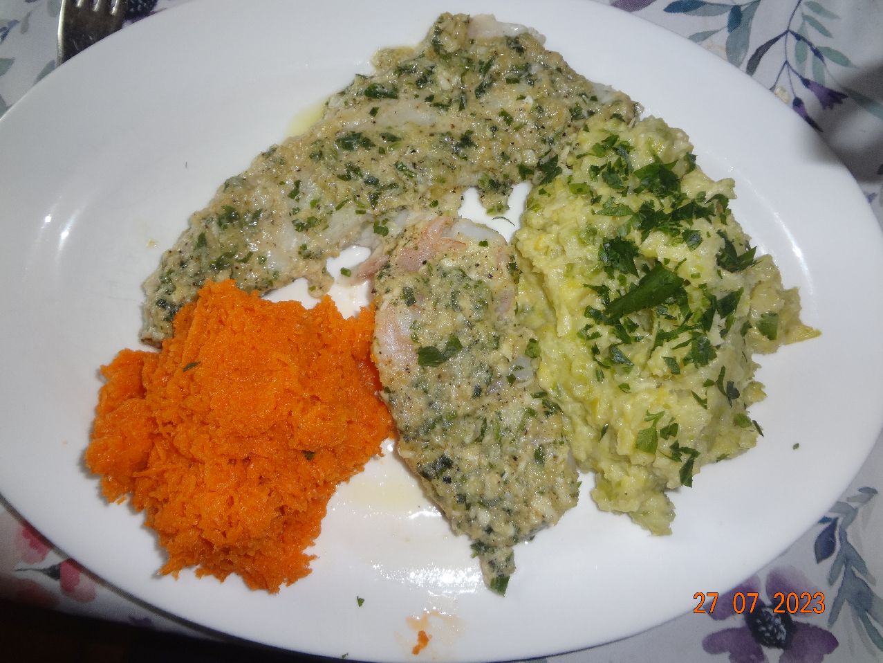 Doraden-Filet Müllerin mit Nussbutter, Kartoffel-Wirsing-Gemüse, Möhrensalat