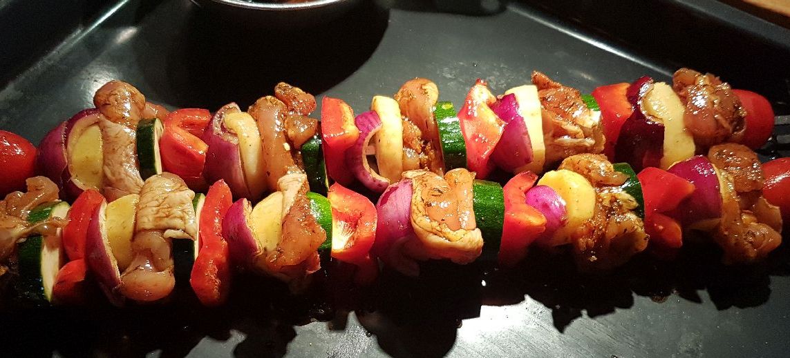 Gegrillter Hähnchen-Gemüse-Spieß(*), Lollo-Rosso-Salat mit Leinöl