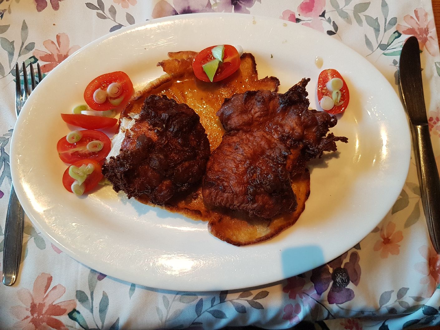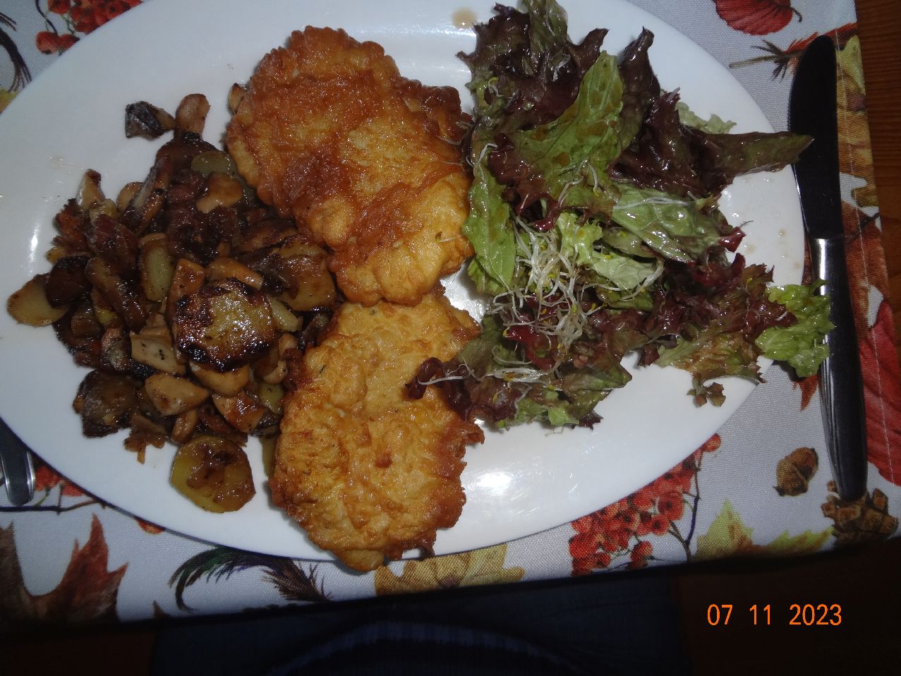 Paniertes Kasseler-Steak, Apfel-Rotkohl, Pet.-Kart., Feldsalat