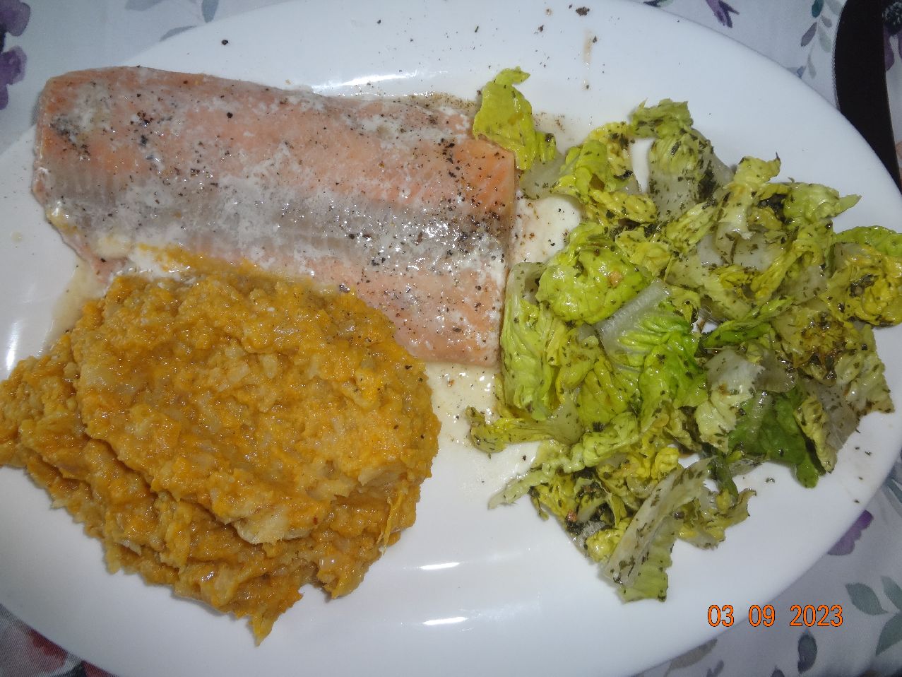 Forellen-Filet Müllerin auf Mandel-Spinat mit geflämmten Sellerie, Salat wie gestern