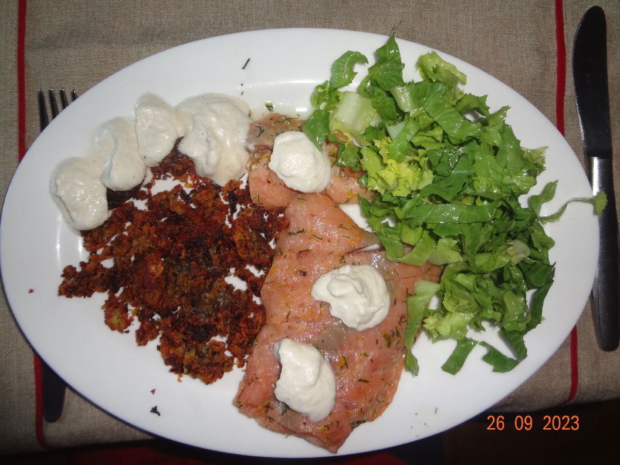 Marinierter Lachs mit Süßkartoffel-Röstis, Sahne-Merrettich, Endivien-Salat mit Senf-Honig-Marinade